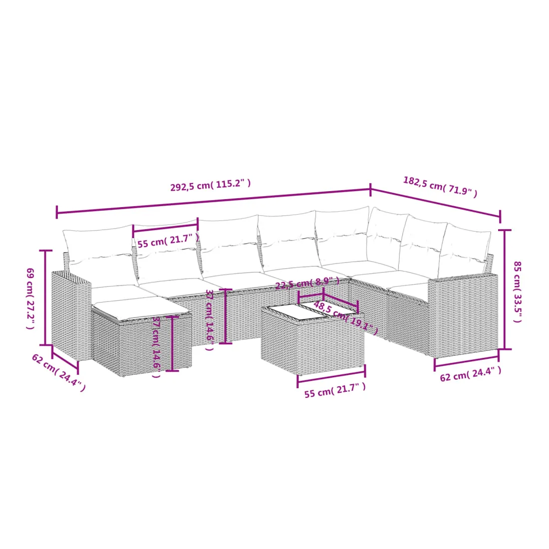 - 8 x coussin d'assise avec housse amovible et lavable