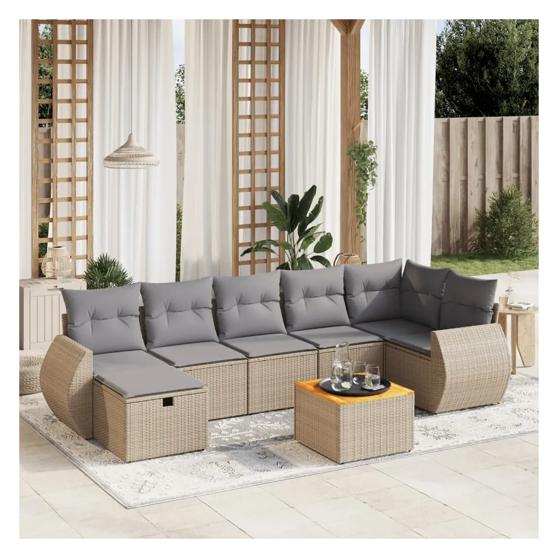 Cet ensemble de canapés de jardin est le complément parfait de votre arrière-cour, terrasse ou patio, offrant un espace confortable et accueillant pour discuter avec la famille et les amis ou simplement se détendre et profiter de l'extérieur. Matériau durable : la résine tressée, également connue sous le nom de poly rotin, est un matériau synthétique solide et nécessitant peu d'entretien qui ressemble au rotin naturel. Il est léger, facile à nettoyer et couramment utilisé pour les meubles d'extérieur en raison de sa durabilité et de ses propriétés de résistance aux intempéries.Dessus stable et facile à nettoyer : cette table de jardin a un dessus en bois d'acacia robuste, durable et facile à nettoyer avec un chiffon humide.Housse amovible et lavable : ces coussins de siège sont dotés de housses amovibles pour un lavage et un entretien faciles.Cadre robuste et stable : le cadre en acier enduit de poudre assure la solidité et la stabilité du meuble de jardin pour une utilisation quotidienne à l'extérieur.Conception modulaire : cet ensemble de meubles d'extérieur a une conception modulaire, ce qui le rend complètement flexible et facile à déplacer, afin que vous puissiez créer un agencement de meubles d'extérieur personnalisé. Bon à savoir :Pour que vos meubles d'extérieur restent beaux, nous vous recommandons de les protéger avec une housse imperméable.