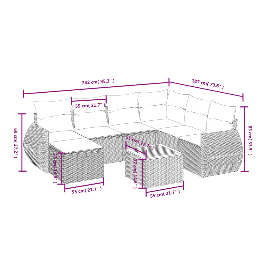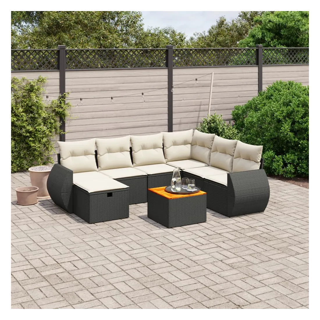 Cet ensemble de canapés de jardin est le complément parfait de votre arrière-cour, terrasse ou patio, offrant un espace confortable et accueillant pour discuter avec la famille et les amis ou simplement se détendre et profiter de l'extérieur. Matériau durable : la résine tressée, également connue sous le nom de poly rotin, est un matériau synthétique solide et nécessitant peu d'entretien qui ressemble au rotin naturel. Il est léger, facile à nettoyer et couramment utilisé pour les meubles d'extérieur en raison de sa durabilité et de ses propriétés de résistance aux intempéries.Dessus stable et facile à nettoyer : cette table de jardin a un dessus en bois d'acacia robuste, durable et facile à nettoyer avec un chiffon humide.Housse amovible et lavable : ces coussins de siège sont dotés de housses amovibles pour un lavage et un entretien faciles.Cadre robuste et stable : le cadre en acier enduit de poudre assure la solidité et la stabilité du meuble de jardin pour une utilisation quotidienne à l'extérieur.Conception modulaire : cet ensemble de meubles d'extérieur a une conception modulaire, ce qui le rend complètement flexible et facile à déplacer, afin que vous puissiez créer un agencement de meubles d'extérieur personnalisé. Bon à savoir :Pour que vos meubles d'extérieur restent beaux, nous vous recommandons de les protéger avec une housse imperméable.