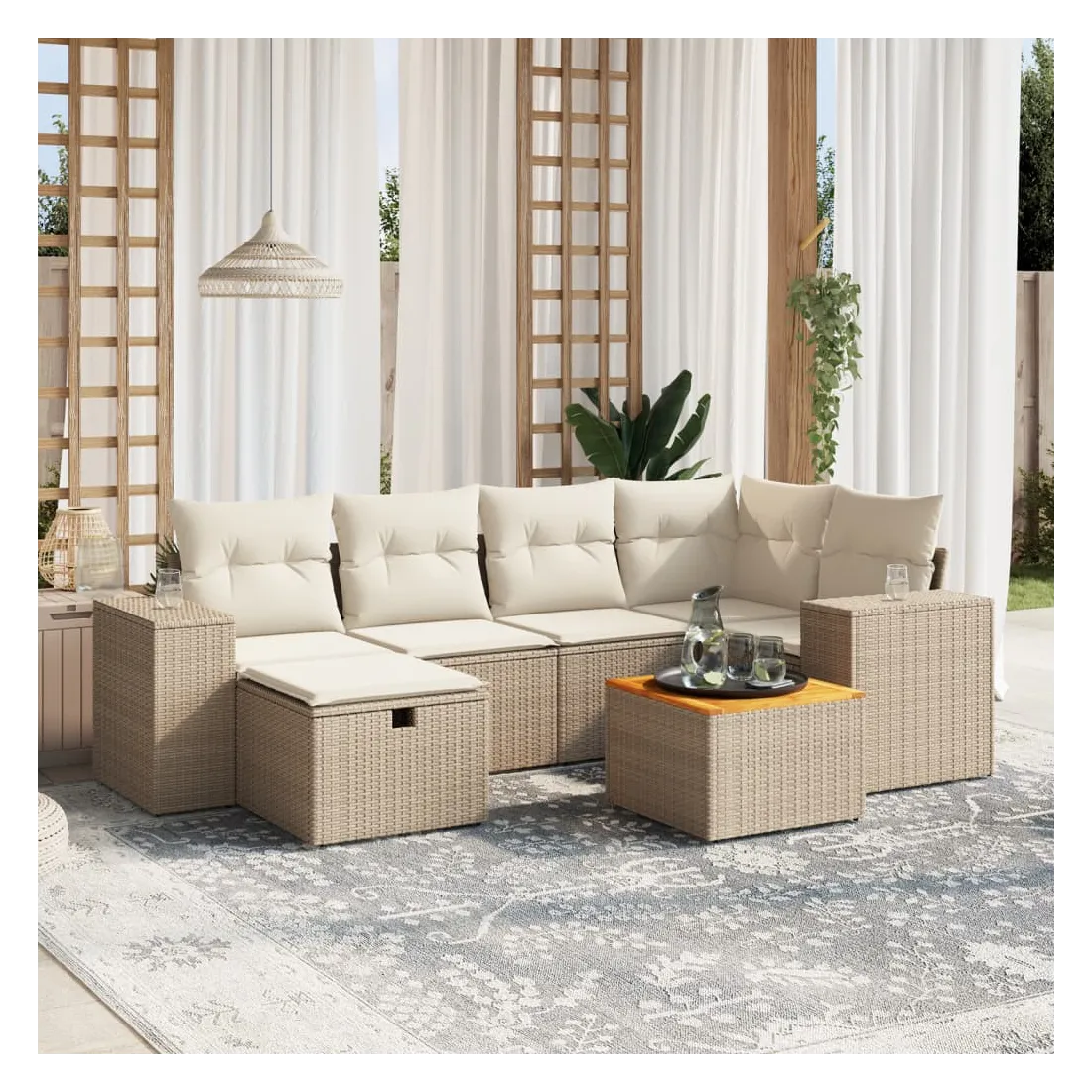 Cet ensemble de canapés de jardin est le complément parfait de votre arrière-cour, terrasse ou patio, offrant un espace confortable et accueillant pour discuter avec la famille et les amis ou simplement se détendre et profiter de l'extérieur. Matériau durable : la résine tressée, également connue sous le nom de poly rotin, est un matériau synthétique solide et nécessitant peu d'entretien qui ressemble au rotin naturel. Il est léger, facile à nettoyer et couramment utilisé pour les meubles d'extérieur en raison de sa durabilité et de ses propriétés de résistance aux intempéries.Dessus stable et facile à nettoyer : cette table de jardin a un dessus en bois d'acacia robuste, durable et facile à nettoyer avec un chiffon humide.Housse amovible et lavable : ces coussins de siège sont dotés de housses amovibles pour un lavage et un entretien faciles.Cadre robuste et stable : le cadre en acier enduit de poudre assure la solidité et la stabilité du meuble de jardin pour une utilisation quotidienne à l'extérieur.Conception modulaire : cet ensemble de meubles d'extérieur a une conception modulaire, ce qui le rend complètement flexible et facile à déplacer, afin que vous puissiez créer un agencement de meubles d'extérieur personnalisé. Bon à savoir :Pour que vos meubles d'extérieur restent beaux, nous vous recommandons de les protéger avec une housse imperméable.