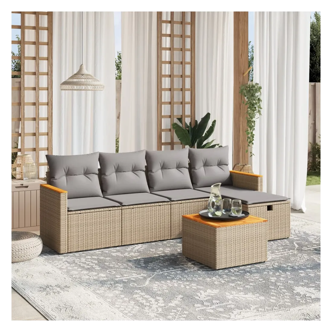 Cet ensemble de canapés de jardin est le complément parfait de votre arrière-cour, terrasse ou patio, offrant un espace confortable et accueillant pour discuter avec la famille et les amis ou simplement se détendre et profiter de l'extérieur. Matériau durable : la résine tressée, également connue sous le nom de poly rotin, est un matériau synthétique solide et nécessitant peu d'entretien qui ressemble au rotin naturel. Il est léger, facile à nettoyer et couramment utilisé pour les meubles d'extérieur en raison de sa durabilité et de ses propriétés de résistance aux intempéries.Dessus stable et facile à nettoyer : cette table de jardin a un dessus en bois d'acacia robuste, durable et facile à nettoyer avec un chiffon humide.Housse amovible et lavable : ces coussins de siège sont dotés de housses amovibles pour un lavage et un entretien faciles.Cadre robuste et stable : le cadre en acier enduit de poudre assure la solidité et la stabilité du meuble de jardin pour une utilisation quotidienne à l'extérieur.Conception modulaire : cet ensemble de meubles d'extérieur a une conception modulaire, ce qui le rend complètement flexible et facile à déplacer, afin que vous puissiez créer un agencement de meubles d'extérieur personnalisé. Bon à savoir :Pour que vos meubles d'extérieur restent beaux, nous vous recommandons de les protéger avec une housse imperméable.