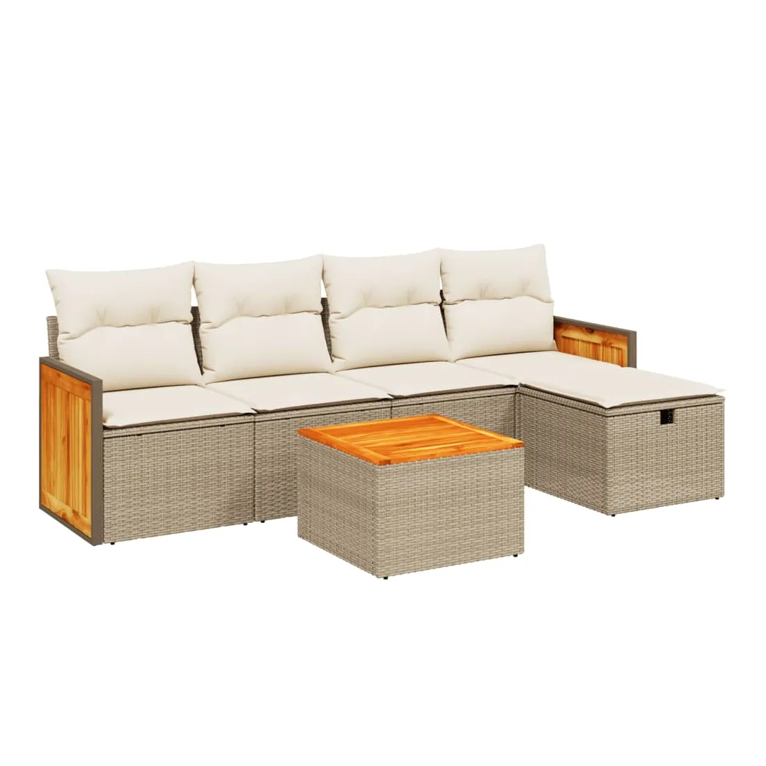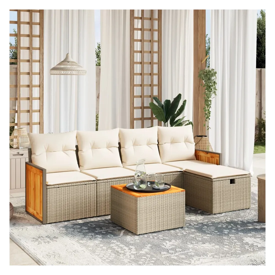 Cet ensemble de canapés de jardin est le complément parfait de votre arrière-cour, terrasse ou patio, offrant un espace confortable et accueillant pour discuter avec la famille et les amis ou simplement se détendre et profiter de l'extérieur. Matériau durable : la résine tressée, également connue sous le nom de poly rotin, est un matériau synthétique solide et nécessitant peu d'entretien qui ressemble au rotin naturel. Il est léger, facile à nettoyer et couramment utilisé pour les meubles d'extérieur en raison de sa durabilité et de ses propriétés de résistance aux intempéries.Dessus stable et facile à nettoyer : cette table de jardin a un dessus en bois d'acacia robuste, durable et facile à nettoyer avec un chiffon humide.Housse amovible et lavable : ces coussins de siège sont dotés de housses amovibles pour un lavage et un entretien faciles.Cadre robuste et stable : le cadre en acier enduit de poudre assure la solidité et la stabilité du meuble de jardin pour une utilisation quotidienne à l'extérieur.Conception modulaire : cet ensemble de meubles d'extérieur a une conception modulaire, ce qui le rend complètement flexible et facile à déplacer, afin que vous puissiez créer un agencement de meubles d'extérieur personnalisé. Bon à savoir :Pour que vos meubles d'extérieur restent beaux, nous vous recommandons de les protéger avec une housse imperméable.