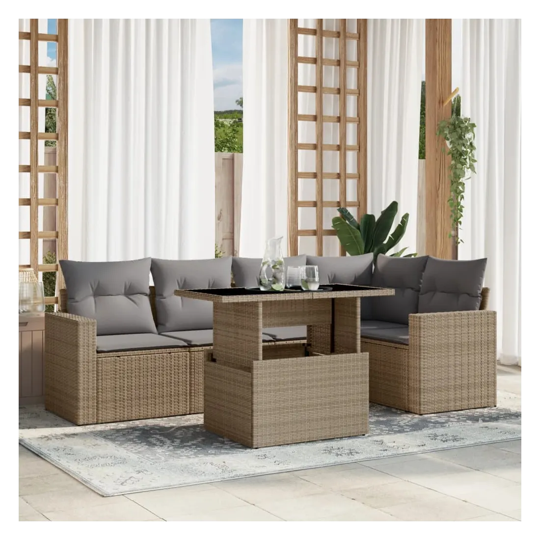 Cet ensemble de canapés de jardin est le complément parfait de votre arrière-cour, terrasse ou patio, offrant un espace confortable et accueillant pour discuter avec la famille et les amis ou simplement se détendre et profiter de l'extérieur. Matériau durable : la résine tressée, également connue sous le nom de poly rotin, est un matériau synthétique solide et nécessitant peu d'entretien qui ressemble au rotin naturel. Il est léger, facile à nettoyer et couramment utilisé pour les meubles d'extérieur en raison de sa durabilité et de ses propriétés de résistance aux intempéries.Dessus de table réglable : le dessus de table peut être soulevé pour rendre la table plus haute, ce qui transforme la table d'extérieur d'une table basse à une table de salle à manger. Elle est parfaite pour recevoir des invités ou prendre des repas à l'extérieur.Expérience d'assise confortable : ce mobilier d'extérieur, doté de coussins épais, offre une expérience d'assise confortable.Housse amovible et lavable : ces coussins de siège sont dotés de housses amovibles pour un lavage et un entretien faciles.Conception modulaire : cet ensemble de meubles d'extérieur a une conception modulaire, ce qui le rend complètement flexible et facile à déplacer, afin que vous puissiez créer un agencement de meubles d'extérieur personnalisé. Bon à savoir :Pour que vos meubles d'extérieur restent beaux, nous vous recommandons de les protéger avec une housse imperméable.