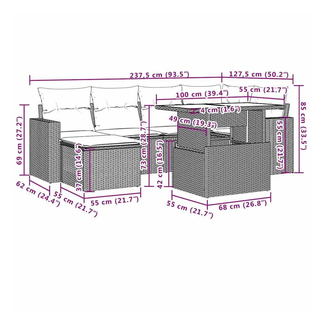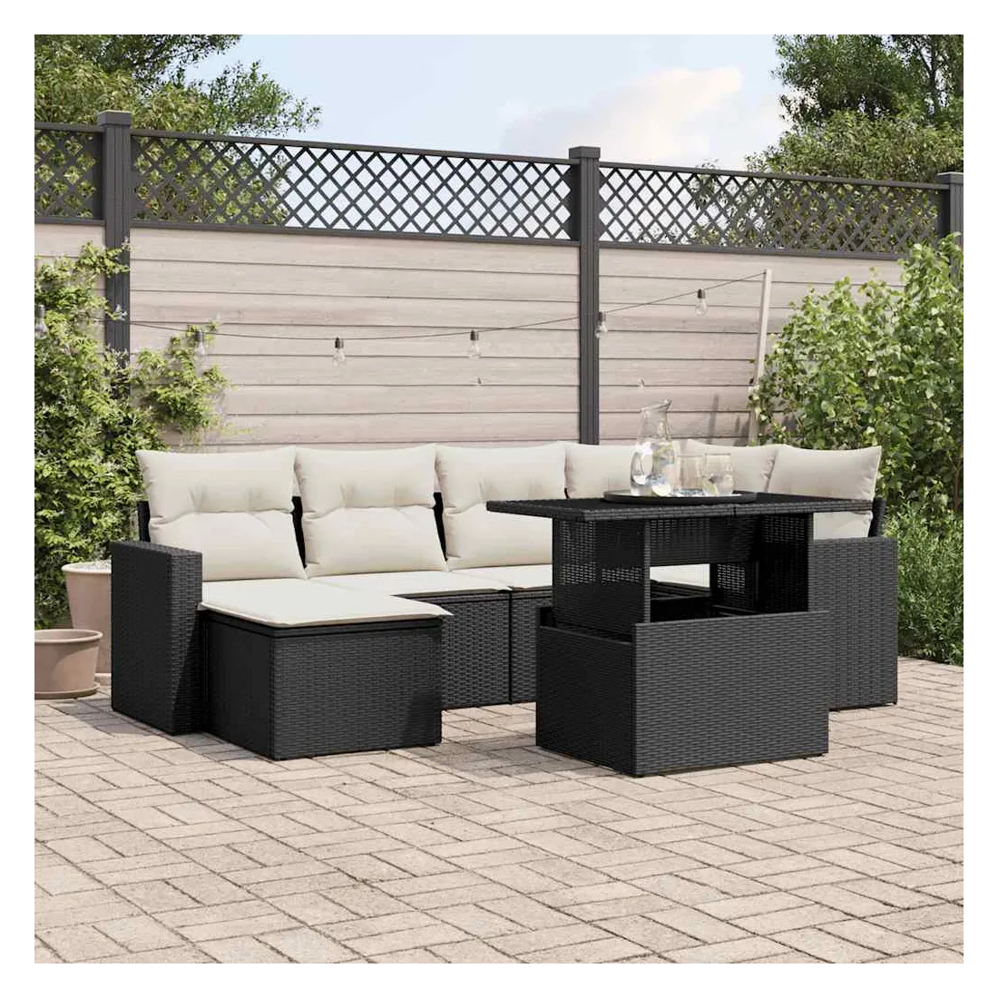Cet ensemble de canapés de jardin est le complément parfait de votre arrière-cour, terrasse ou patio, offrant un espace confortable et accueillant pour discuter avec la famille et les amis ou simplement se détendre et profiter de l'extérieur. Matériau durable : la résine tressée, également connue sous le nom de poly rotin, est un matériau synthétique solide et nécessitant peu d'entretien qui ressemble au rotin naturel. Il est léger, facile à nettoyer et couramment utilisé pour les meubles d'extérieur en raison de sa durabilité et de ses propriétés de résistance aux intempéries.Dessus de table réglable : le dessus de table peut être soulevé pour rendre la table plus haute, ce qui transforme la table d'extérieur d'une table basse à une table de salle à manger. Elle est parfaite pour recevoir des invités ou prendre des repas à l'extérieur.Expérience d'assise confortable : ce mobilier d'extérieur, doté de coussins épais, offre une expérience d'assise confortable.Housse amovible et lavable : ces coussins de siège sont dotés de housses amovibles pour un lavage et un entretien faciles.Conception modulaire : cet ensemble de meubles d'extérieur a une conception modulaire, ce qui le rend complètement flexible et facile à déplacer, afin que vous puissiez créer un agencement de meubles d'extérieur personnalisé. Bon à savoir :Pour que vos meubles d'extérieur restent beaux, nous vous recommandons de les protéger avec une housse imperméable.