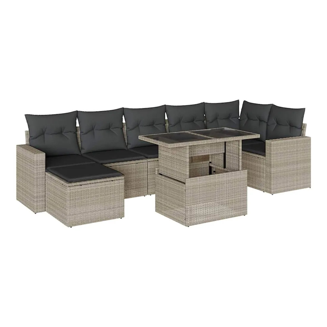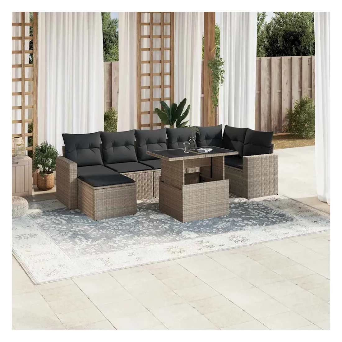 Cet ensemble de canapés de jardin est le complément parfait de votre arrière-cour, terrasse ou patio, offrant un espace confortable et accueillant pour discuter avec la famille et les amis ou simplement se détendre et profiter de l'extérieur. Matériau durable : la résine tressée, également connue sous le nom de poly rotin, est un matériau synthétique solide et nécessitant peu d'entretien qui ressemble au rotin naturel. Elle est légère, facile à nettoyer et couramment utilisée pour les meubles d'extérieur en raison de sa durabilité et de ses propriétés de résistance aux intempéries.Dessus de table réglable : le dessus de table peut être soulevé pour rendre la table plus haute, ce qui transforme la table d'extérieur d'une table basse à une table de salle à manger. Elle est parfaite pour recevoir des invités ou prendre des repas à l'extérieur.Expérience d'assise confortable : ce mobilier d'extérieur, doté de coussins épais, offre une expérience d'assise confortable.Housse amovible et lavable : ces coussins de siège sont dotés de housses amovibles pour un lavage et un entretien faciles.Conception modulaire : cet ensemble de meubles d'extérieur a une conception modulaire, ce qui le rend complètement flexible et facile à déplacer, afin que vous puissiez créer un agencement de meubles d'extérieur personnalisé. Bon à savoir :Pour que vos meubles d'extérieur restent beaux, nous vous recommandons de les protéger avec une housse imperméable.