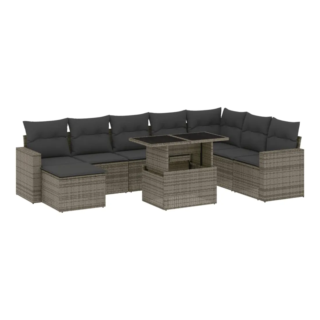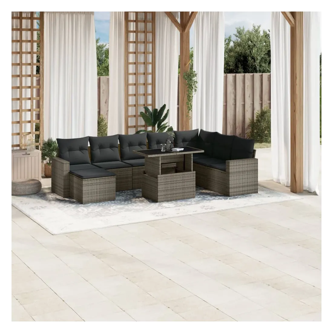 Cet ensemble de canapés de jardin est le complément parfait de votre arrière-cour, terrasse ou patio, offrant un espace confortable et accueillant pour discuter avec la famille et les amis ou simplement se détendre et profiter de l'extérieur. Matériau durable : la résine tressée, également connue sous le nom de poly rotin, est un matériau synthétique solide et nécessitant peu d'entretien qui ressemble au rotin naturel. Il est léger, facile à nettoyer et couramment utilisé pour les meubles d'extérieur en raison de sa durabilité et de ses propriétés de résistance aux intempéries.Dessus de table réglable : le dessus de table peut être soulevé pour rendre la table plus haute, ce qui transforme la table d'extérieur d'une table basse à une table de salle à manger. Elle est parfaite pour recevoir des invités ou prendre des repas à l'extérieur.Expérience d'assise confortable : ce mobilier d'extérieur, doté de coussins épais, offre une expérience d'assise confortable.Housse amovible et lavable : ces coussins de siège sont dotés de housses amovibles pour un lavage et un entretien faciles.Conception modulaire : cet ensemble de meubles d'extérieur a une conception modulaire, ce qui le rend complètement flexible et facile à déplacer, afin que vous puissiez créer un agencement de meubles d'extérieur personnalisé. Bon à savoir :Pour que vos meubles d'extérieur restent beaux, nous vous recommandons de les protéger avec une housse imperméable.