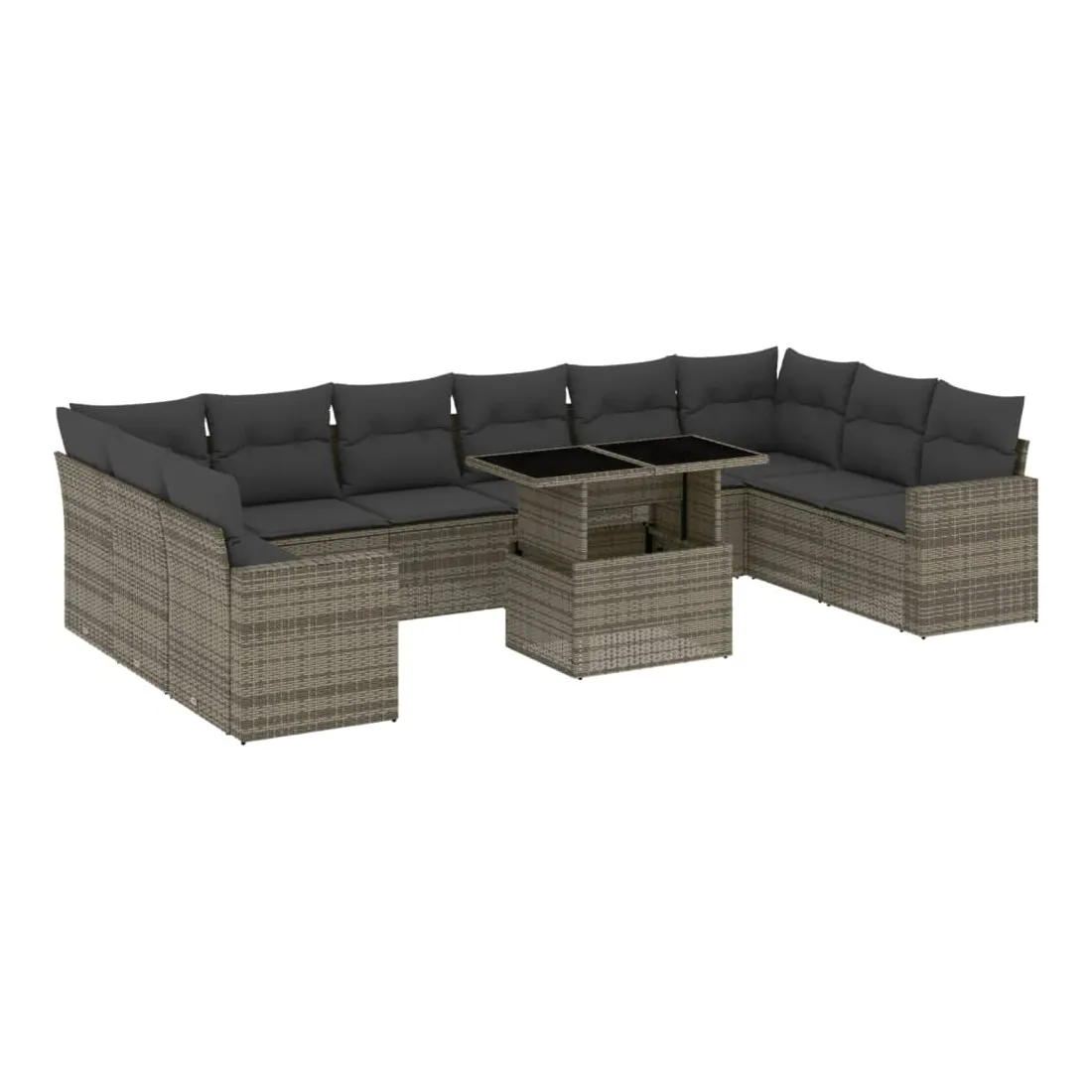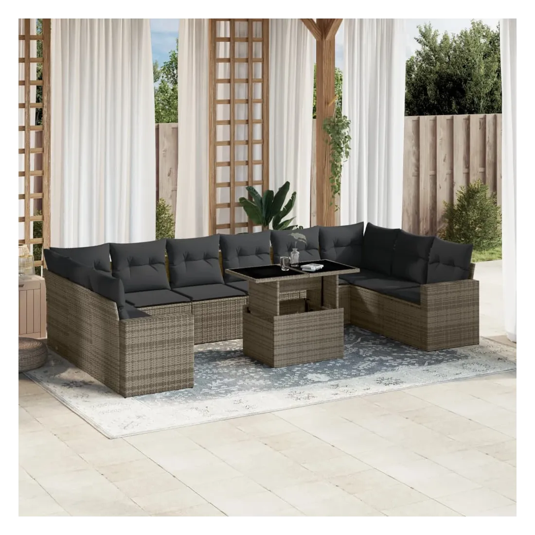 Cet ensemble de canapés de jardin est le complément parfait de votre arrière-cour, terrasse ou patio, offrant un espace confortable et accueillant pour discuter avec la famille et les amis ou simplement se détendre et profiter de l'extérieur. Matériau durable : la résine tressée, également connue sous le nom de poly rotin, est un matériau synthétique solide et nécessitant peu d'entretien qui ressemble au rotin naturel. Il est léger, facile à nettoyer et couramment utilisé pour les meubles d'extérieur en raison de sa durabilité et de ses propriétés de résistance aux intempéries.Dessus de table réglable : le dessus de table peut être soulevé pour rendre la table plus haute, ce qui transforme la table d'extérieur d'une table basse à une table de salle à manger. Elle est parfaite pour recevoir des invités ou prendre des repas à l'extérieur.Expérience d'assise confortable : ce mobilier d'extérieur, doté de coussins épais, offre une expérience d'assise confortable.Housse amovible et lavable : ces coussins de siège sont dotés de housses amovibles pour un lavage et un entretien faciles.Conception modulaire : cet ensemble de meubles d'extérieur a une conception modulaire, ce qui le rend complètement flexible et facile à déplacer, afin que vous puissiez créer un agencement de meubles d'extérieur personnalisé. Bon à savoir :Pour que vos meubles d'extérieur restent beaux, nous vous recommandons de les protéger avec une housse imperméable.