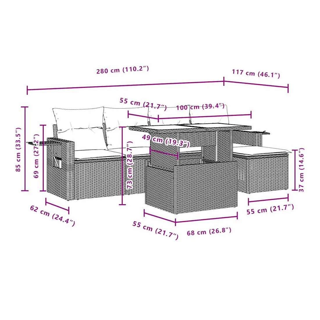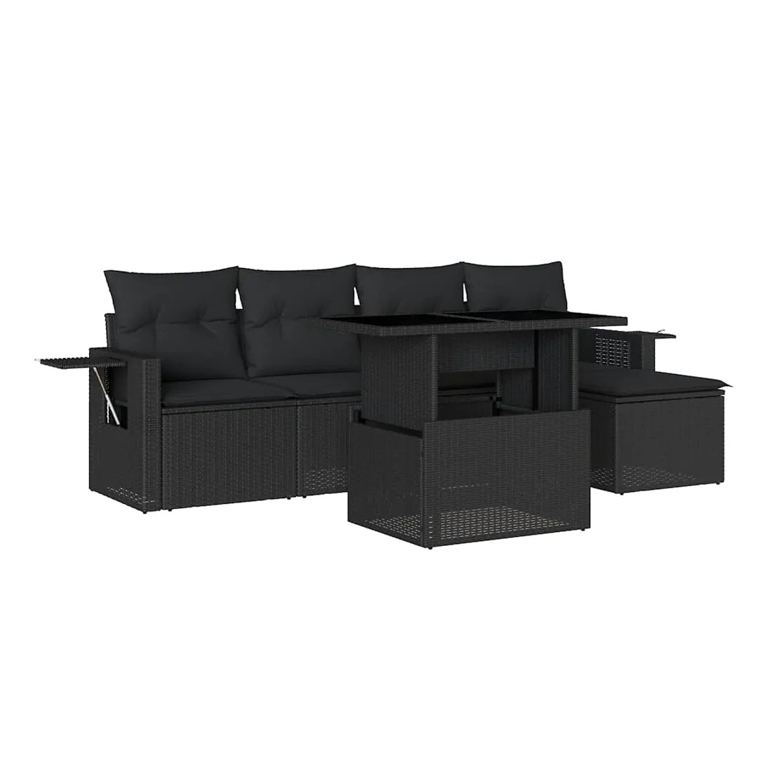 Cet ensemble de canapés de jardin est le complément parfait de votre arrière-cour, terrasse ou patio, offrant un espace confortable et accueillant pour discuter avec la famille et les amis ou simplement se détendre et profiter de l'extérieur. Matériau durable : la résine tressée, également connue sous le nom de poly rotin, est un matériau synthétique solide et nécessitant peu d'entretien qui ressemble au rotin naturel. Il est léger, facile à nettoyer et couramment utilisé pour les meubles d'extérieur en raison de sa durabilité et de ses propriétés de résistance aux intempéries.Dessus de table réglable : le dessus de table peut être soulevé pour rendre la table plus haute, ce qui transforme la table d'extérieur d'une table basse à une table de salle à manger. Elle est parfaite pour recevoir des invités ou prendre des repas à l'extérieur.Table d'appoint pratique : ce mobilier d'extérieur comprend des tables d'appoint pliables avec un ressort à gaz sur les accoudoirs, offrant des endroits pratiques pour garder vos essentiels à portée de main. Expérience d'assise confortable : ce mobilier d'extérieur, doté de coussins épais, offre une expérience d'assise confortable.Conception modulaire : cet ensemble de meubles d'extérieur a une conception modulaire, ce qui le rend complètement flexible et facile à déplacer, afin que vous puissiez créer un agencement de meubles d'extérieur personnalisé. Bon à savoir :Pour que vos meubles d'extérieur restent beaux, nous vous recommandons de les protéger avec une housse imperméable.