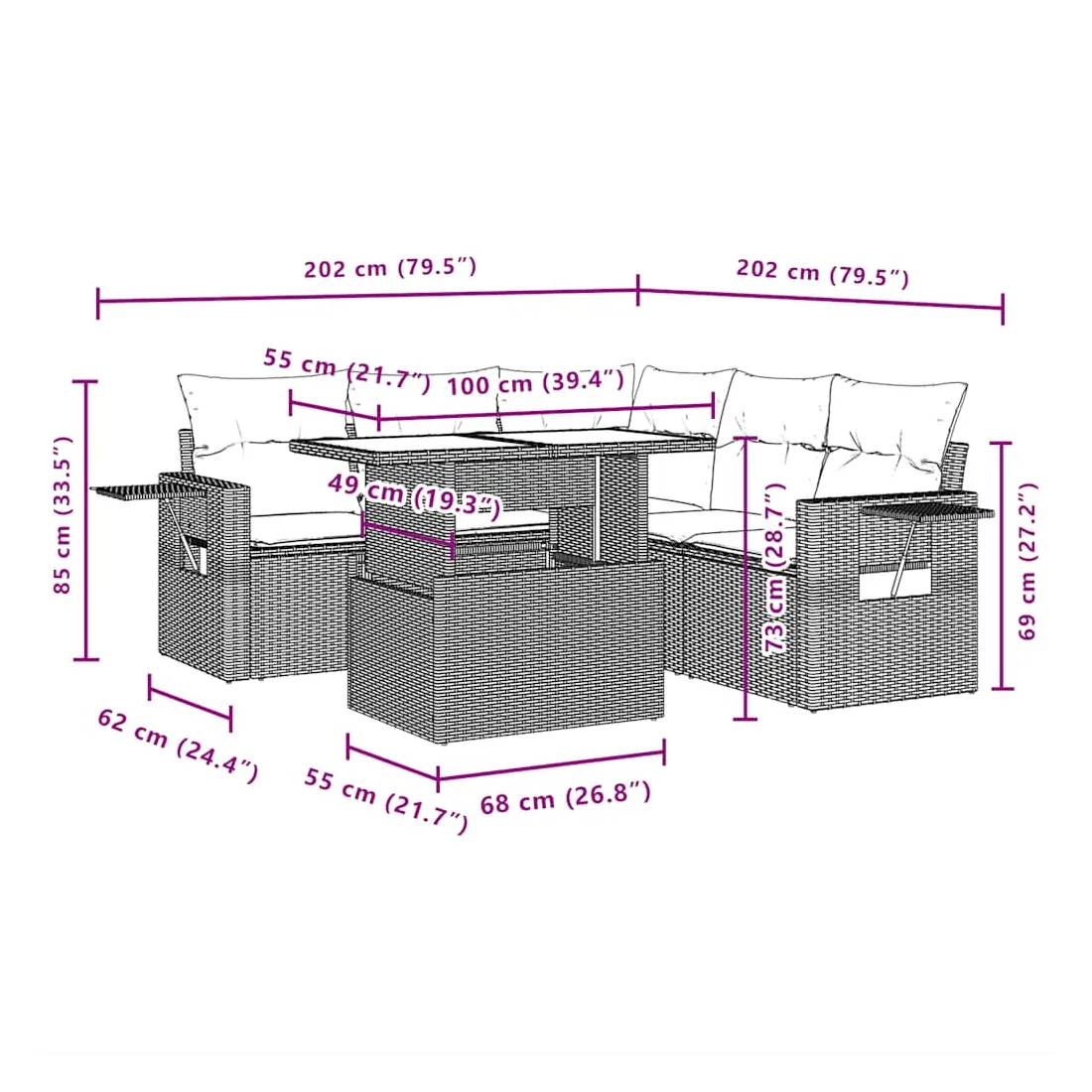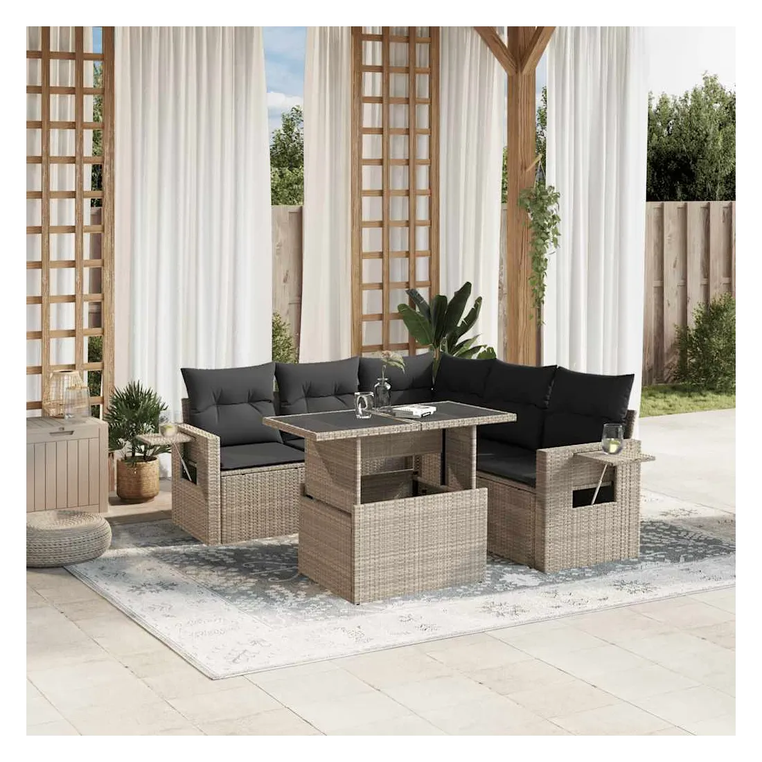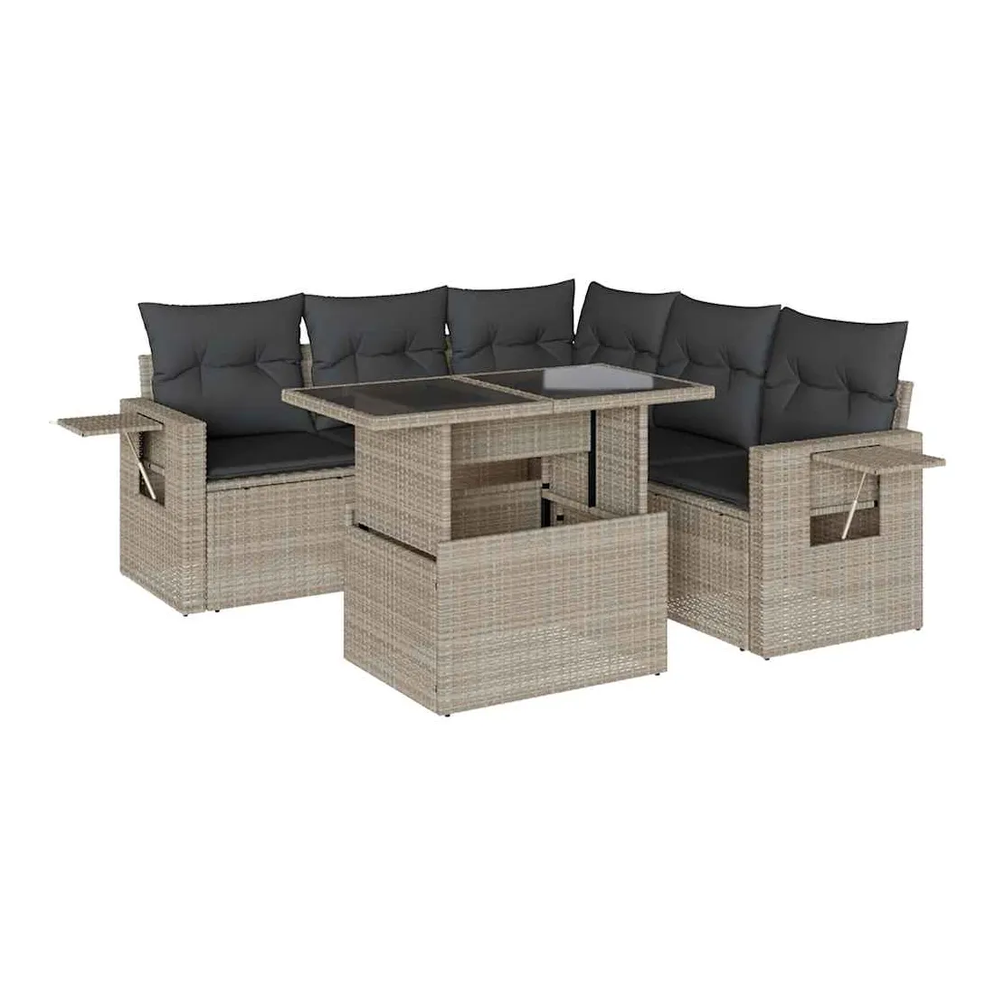 Cet ensemble de canapés de jardin est le complément parfait de votre arrière-cour, terrasse ou patio, offrant un espace confortable et accueillant pour discuter avec la famille et les amis ou simplement se détendre et profiter de l'extérieur. Matériau durable : la résine tressée, également connue sous le nom de poly rotin, est un matériau synthétique solide et nécessitant peu d'entretien qui ressemble au rotin naturel. Elle est légère, facile à nettoyer et couramment utilisée pour les meubles d'extérieur en raison de sa durabilité et de ses propriétés de résistance aux intempéries.Dessus de table réglable : le dessus de table peut être soulevé pour rendre la table plus haute, ce qui transforme la table d'extérieur d'une table basse à une table de salle à manger. Elle est parfaite pour recevoir des invités ou prendre des repas à l'extérieur.Table d'appoint pratique : ce mobilier d'extérieur comprend des tables d'appoint pliables avec un ressort à gaz sur les accoudoirs, offrant des endroits pratiques pour garder vos essentiels à portée de main. Expérience d'assise confortable : ce mobilier d'extérieur, doté de coussins épais, offre une expérience d'assise confortable.Conception modulaire : cet ensemble de meubles d'extérieur a une conception modulaire, ce qui le rend complètement flexible et facile à déplacer, afin que vous puissiez créer un agencement de meubles d'extérieur personnalisé. Bon à savoir :Pour que vos meubles d'extérieur restent beaux, nous vous recommandons de les protéger avec une housse imperméable.