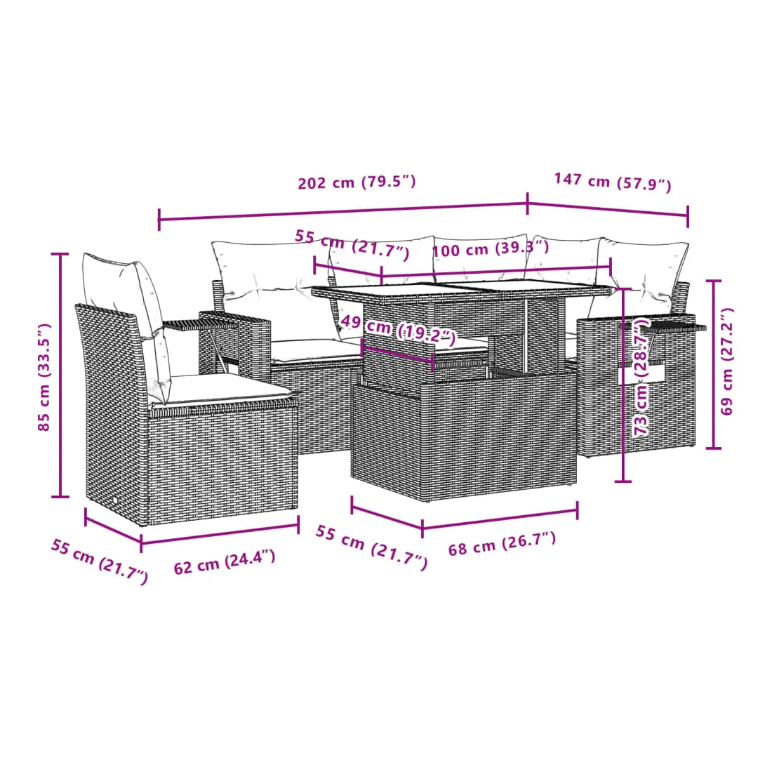 Cet ensemble de canapés de jardin est le complément parfait de votre arrière-cour, terrasse ou patio, offrant un espace confortable et accueillant pour discuter avec la famille et les amis ou simplement se détendre et profiter de l'extérieur. Matériau durable : la résine tressée, également connue sous le nom de poly rotin, est un matériau synthétique solide et nécessitant peu d'entretien qui ressemble au rotin naturel. Il est léger, facile à nettoyer et couramment utilisé pour les meubles d'extérieur en raison de sa durabilité et de ses propriétés de résistance aux intempéries.Dessus de table réglable : le dessus de table peut être soulevé pour rendre la table plus haute, ce qui transforme la table d'extérieur d'une table basse à une table de salle à manger. Elle est parfaite pour recevoir des invités ou prendre des repas à l'extérieur.Table d'appoint pratique : ce mobilier d'extérieur comprend des tables d'appoint pliables avec un ressort à gaz sur les accoudoirs, offrant des endroits pratiques pour garder vos essentiels à portée de main. Expérience d'assise confortable : ce mobilier d'extérieur, doté de coussins épais, offre une expérience d'assise confortable.Conception modulaire : cet ensemble de meubles d'extérieur a une conception modulaire, ce qui le rend complètement flexible et facile à déplacer, afin que vous puissiez créer un agencement de meubles d'extérieur personnalisé. Bon à savoir :Pour que vos meubles d'extérieur restent beaux, nous vous recommandons de les protéger avec une housse imperméable.