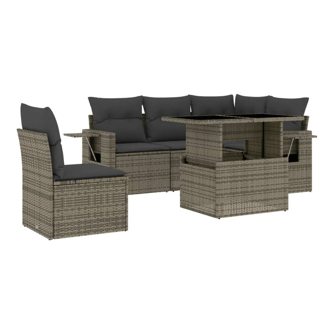 Cet ensemble de canapés de jardin est le complément parfait de votre arrière-cour, terrasse ou patio, offrant un espace confortable et accueillant pour discuter avec la famille et les amis ou simplement se détendre et profiter de l'extérieur. Matériau durable : la résine tressée, également connue sous le nom de poly rotin, est un matériau synthétique solide et nécessitant peu d'entretien qui ressemble au rotin naturel. Il est léger, facile à nettoyer et couramment utilisé pour les meubles d'extérieur en raison de sa durabilité et de ses propriétés de résistance aux intempéries.Dessus de table réglable : le dessus de table peut être soulevé pour rendre la table plus haute, ce qui transforme la table d'extérieur d'une table basse à une table de salle à manger. Elle est parfaite pour recevoir des invités ou prendre des repas à l'extérieur.Table d'appoint pratique : ce mobilier d'extérieur comprend des tables d'appoint pliables avec un ressort à gaz sur les accoudoirs, offrant des endroits pratiques pour garder vos essentiels à portée de main. Expérience d'assise confortable : ce mobilier d'extérieur, doté de coussins épais, offre une expérience d'assise confortable.Conception modulaire : cet ensemble de meubles d'extérieur a une conception modulaire, ce qui le rend complètement flexible et facile à déplacer, afin que vous puissiez créer un agencement de meubles d'extérieur personnalisé. Bon à savoir :Pour que vos meubles d'extérieur restent beaux, nous vous recommandons de les protéger avec une housse imperméable.