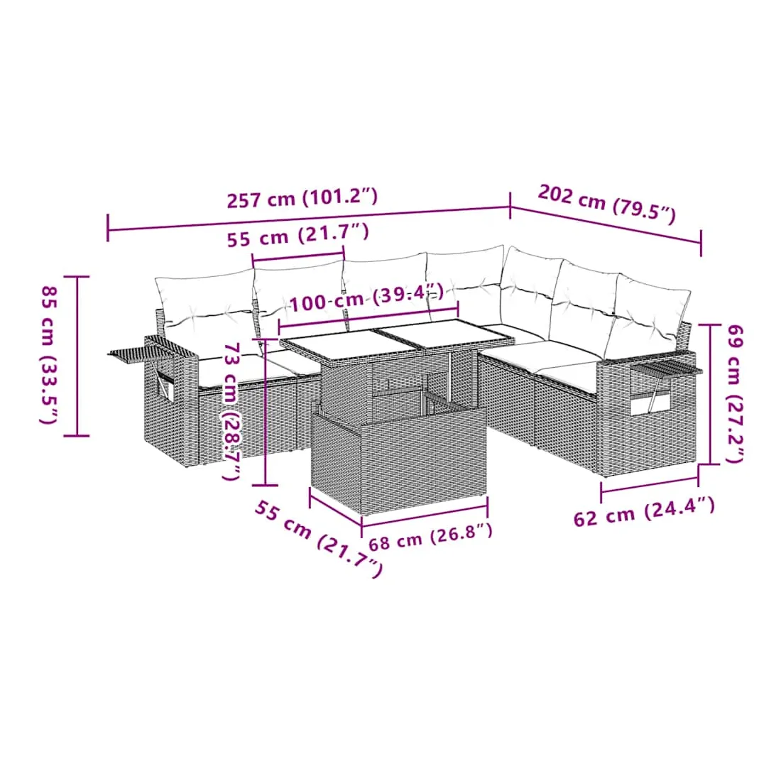 Cet ensemble de canapés de jardin est le complément parfait de votre arrière-cour, terrasse ou patio, offrant un espace confortable et accueillant pour discuter avec la famille et les amis ou simplement se détendre et profiter de l'extérieur. Matériau durable : la résine tressée, également connue sous le nom de poly rotin, est un matériau synthétique solide et nécessitant peu d'entretien qui ressemble au rotin naturel. Il est léger, facile à nettoyer et couramment utilisé pour les meubles d'extérieur en raison de sa durabilité et de ses propriétés de résistance aux intempéries.Dessus de table réglable : le dessus de table peut être soulevé pour rendre la table plus haute, ce qui transforme la table d'extérieur d'une table basse à une table de salle à manger. Elle est parfaite pour recevoir des invités ou prendre des repas à l'extérieur.Table d'appoint pratique : ce mobilier d'extérieur comprend des tables d'appoint pliables avec un ressort à gaz sur les accoudoirs, offrant des endroits pratiques pour garder vos essentiels à portée de main. Expérience d'assise confortable : ce mobilier d'extérieur, doté de coussins épais, offre une expérience d'assise confortable.Conception modulaire : cet ensemble de meubles d'extérieur a une conception modulaire, ce qui le rend complètement flexible et facile à déplacer, afin que vous puissiez créer un agencement de meubles d'extérieur personnalisé. Bon à savoir :Pour que vos meubles d'extérieur restent beaux, nous vous recommandons de les protéger avec une housse imperméable.