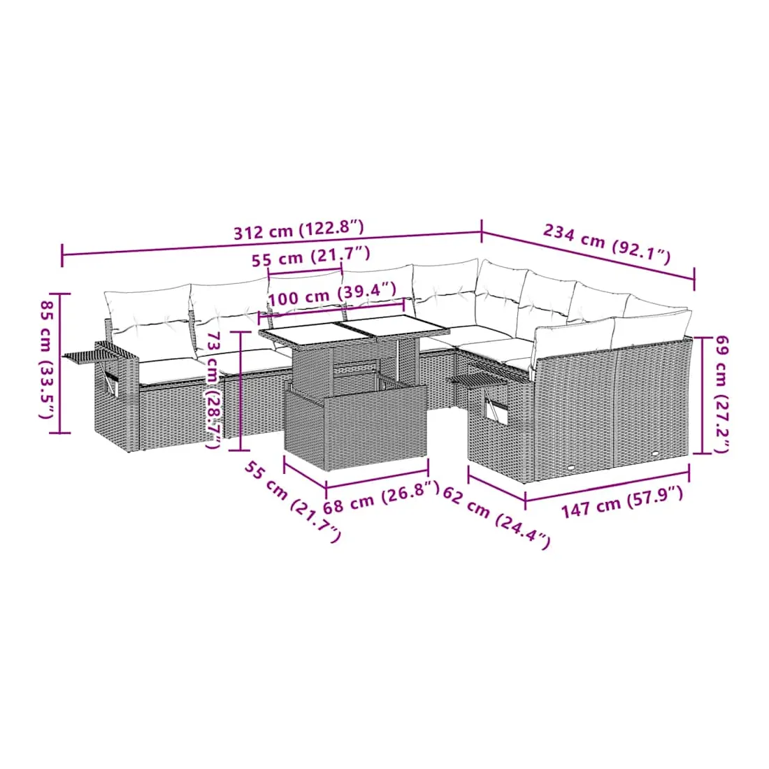 Cet ensemble de canapés de jardin est le complément parfait de votre arrière-cour, terrasse ou patio, offrant un espace confortable et accueillant pour discuter avec la famille et les amis ou simplement se détendre et profiter de l'extérieur. Matériau durable : la résine tressée, également connue sous le nom de poly rotin, est un matériau synthétique solide et nécessitant peu d'entretien qui ressemble au rotin naturel. Il est léger, facile à nettoyer et couramment utilisé pour les meubles d'extérieur en raison de sa durabilité et de ses propriétés de résistance aux intempéries.Dessus de table réglable : le dessus de table peut être soulevé pour rendre la table plus haute, ce qui transforme la table d'extérieur d'une table basse à une table de salle à manger. Elle est parfaite pour recevoir des invités ou prendre des repas à l'extérieur.Table d'appoint pratique : ce mobilier d'extérieur comprend des tables d'appoint pliables avec un ressort à gaz sur les accoudoirs, offrant des endroits pratiques pour garder vos essentiels à portée de main. Expérience d'assise confortable : ce mobilier d'extérieur, doté de coussins épais, offre une expérience d'assise confortable.Conception modulaire : cet ensemble de meubles d'extérieur a une conception modulaire, ce qui le rend complètement flexible et facile à déplacer, afin que vous puissiez créer un agencement de meubles d'extérieur personnalisé. Bon à savoir :Pour que vos meubles d'extérieur restent beaux, nous vous recommandons de les protéger avec une housse imperméable.