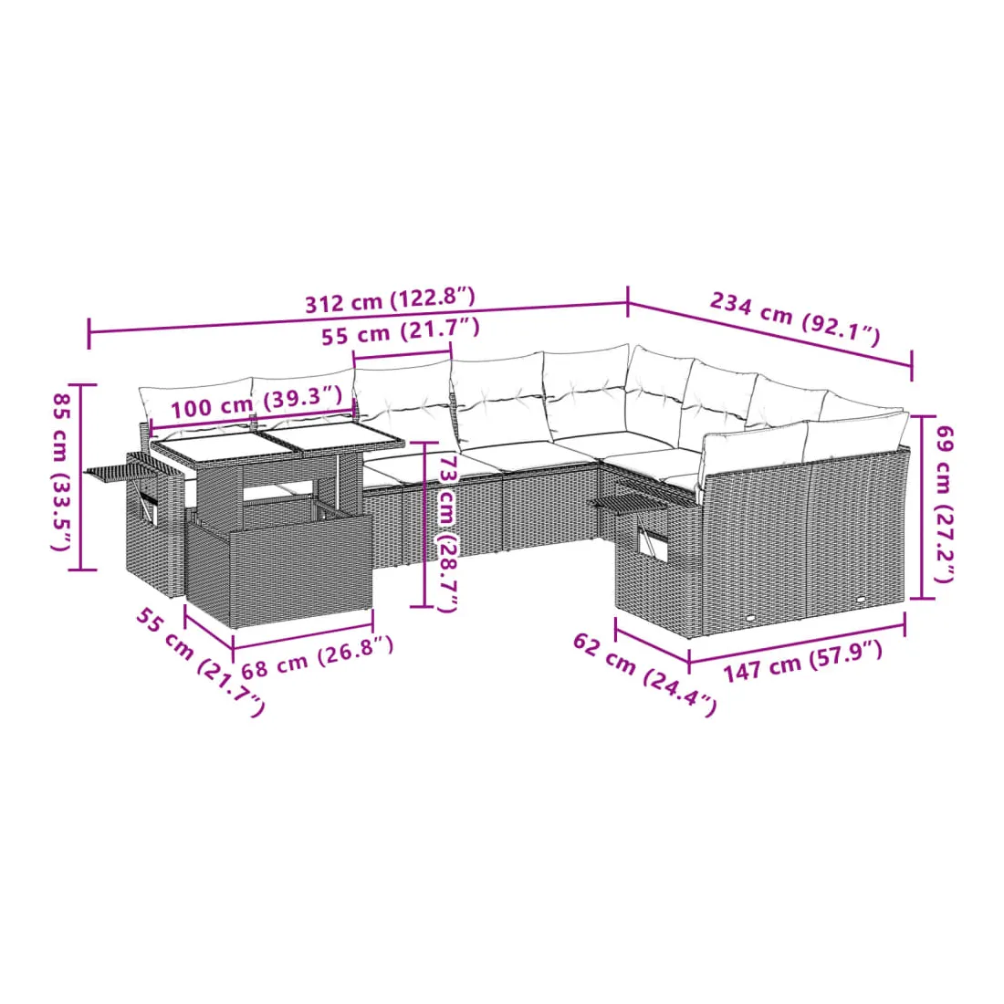 Cet ensemble de canapés de jardin est le complément parfait de votre arrière-cour, terrasse ou patio, offrant un espace confortable et accueillant pour discuter avec la famille et les amis ou simplement se détendre et profiter de l'extérieur. Matériau durable : la résine tressée, également connue sous le nom de poly rotin, est un matériau synthétique solide et nécessitant peu d'entretien qui ressemble au rotin naturel. Il est léger, facile à nettoyer et couramment utilisé pour les meubles d'extérieur en raison de sa durabilité et de ses propriétés de résistance aux intempéries.Dessus de table réglable : le dessus de table peut être soulevé pour rendre la table plus haute, ce qui transforme la table d'extérieur d'une table basse à une table de salle à manger. Elle est parfaite pour recevoir des invités ou prendre des repas à l'extérieur.Table d'appoint pratique : ce mobilier d'extérieur comprend des tables d'appoint pliables avec un ressort à gaz sur les accoudoirs, offrant des endroits pratiques pour garder vos essentiels à portée de main. Expérience d'assise confortable : ce mobilier d'extérieur, doté de coussins épais, offre une expérience d'assise confortable.Conception modulaire : cet ensemble de meubles d'extérieur a une conception modulaire, ce qui le rend complètement flexible et facile à déplacer, afin que vous puissiez créer un agencement de meubles d'extérieur personnalisé. Bon à savoir :Pour que vos meubles d'extérieur restent beaux, nous vous recommandons de les protéger avec une housse imperméable.