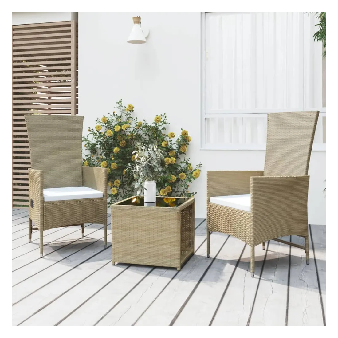 Ce salon de jardin, avec un design élégant et contemporain, sera un excellent choix pour vous détendre dans le jardin. Matériau durable : la résine tressée, également connue sous le nom de rotin poly, résiste aux intempéries et est facile à nettoyer. Elle reste belle à l'extérieur pendant une longue période. Elle offre une excellente qualité, commodité et un aspect esthétique.Cadre stable : l'acier est un matériau exceptionnellement dur et résistant. Il offre robustesse et stabilité.Fonction d'inclinaison : les chaises de jardin de cet ensemble de mobilier de jardin sont spécialement conçues avec une fonction d'inclinaison afin que vous puissiez régler le dossier selon votre confort.Expérience de siège confortable : avec les coussins de siège bien rembourrés, les chaises sont très confortables.Dessus de table pratique : le dessus en verre trempé est parfait pour placer ou afficher vos divers objets essentiels. Il est beau en apparence et facile à nettoyer. Remarque :Pour que vos meubles d'extérieur restent beaux, nous vous recommandons de les protéger avec une housse imperméable. Bon à savoir :Pour faciliter au maximum le montage, chaque produit est livré avec des instructions.