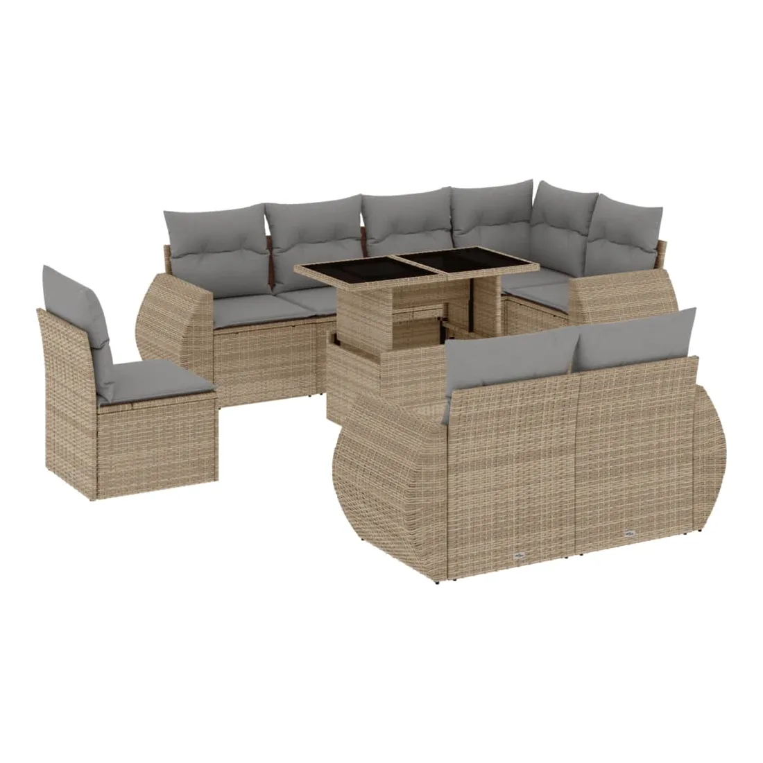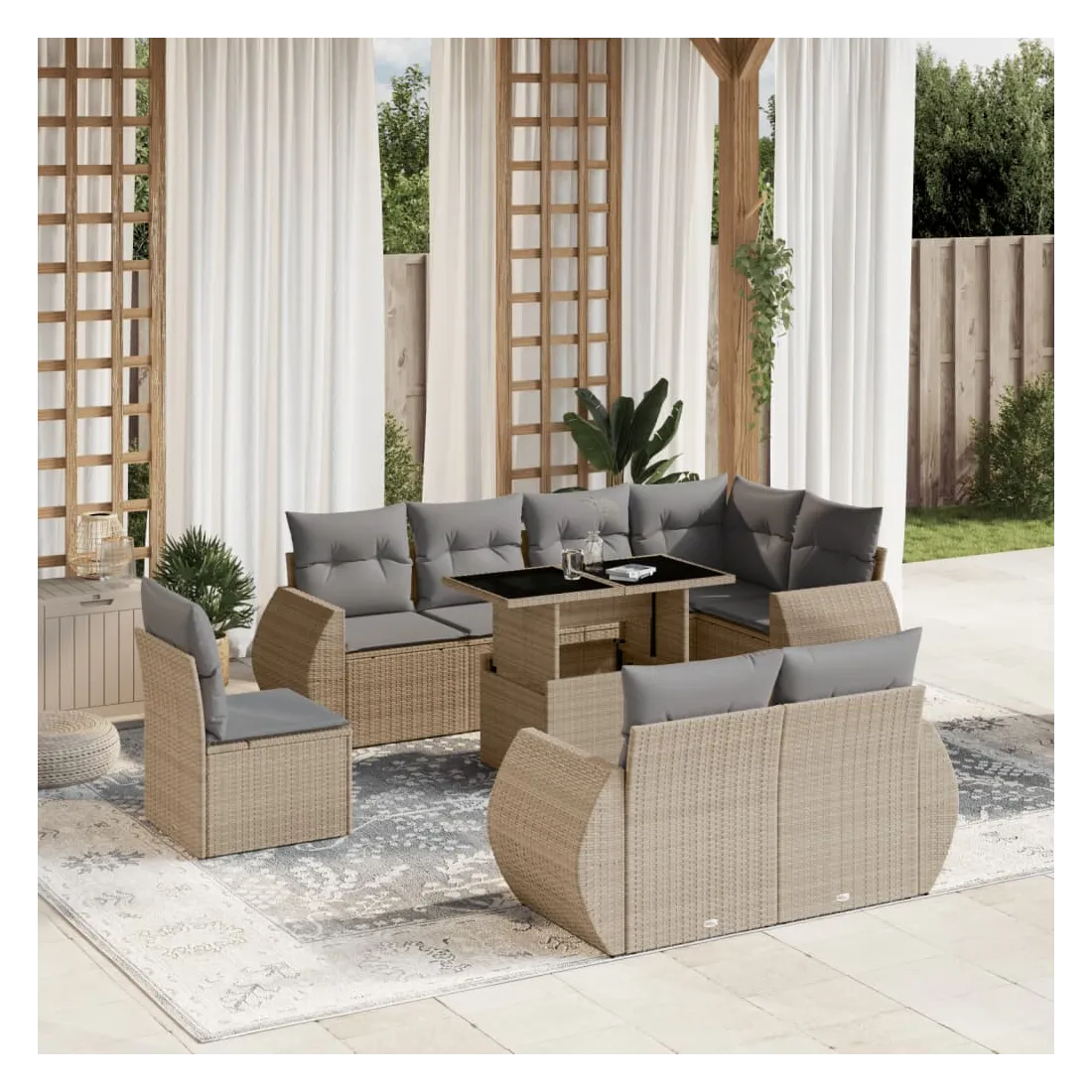 Cet ensemble de canapés de jardin est le complément parfait de votre arrière-cour, terrasse ou patio, offrant un espace confortable et accueillant pour discuter avec la famille et les amis ou simplement se détendre et profiter de l'extérieur. Matériau durable : la résine tressée, également connue sous le nom de poly rotin, est un matériau synthétique solide et nécessitant peu d'entretien qui ressemble au rotin naturel. Il est léger, facile à nettoyer et couramment utilisé pour les meubles d'extérieur en raison de sa durabilité et de ses propriétés de résistance aux intempéries.Dessus de table réglable : le dessus de table peut être soulevé pour rendre la table plus haute, ce qui transforme la table d'extérieur d'une table basse à une table de salle à manger. Elle est parfaite pour recevoir des invités ou prendre des repas à l'extérieur.Expérience d'assise confortable : ce mobilier d'extérieur, doté de coussins épais, offre une expérience d'assise confortable.Housse amovible et lavable : ces coussins de siège sont dotés de housses amovibles pour un lavage et un entretien faciles.Conception modulaire : cet ensemble de meubles d'extérieur a une conception modulaire, ce qui le rend complètement flexible et facile à déplacer, afin que vous puissiez créer un agencement de meubles d'extérieur personnalisé. Bon à savoir :Pour que vos meubles d'extérieur restent beaux, nous vous recommandons de les protéger avec une housse imperméable.