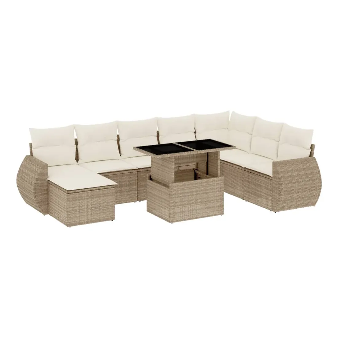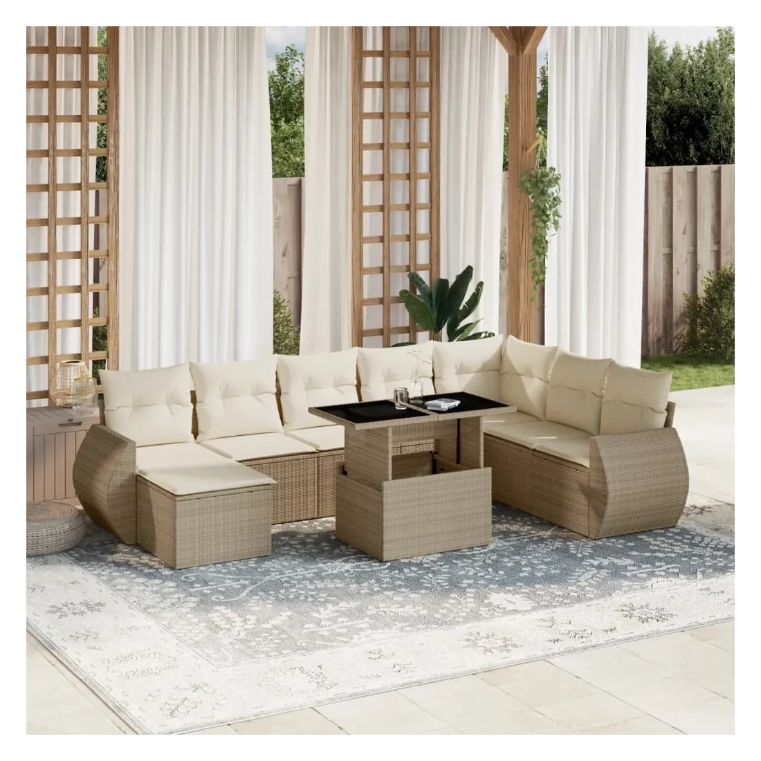 Cet ensemble de canapés de jardin est le complément parfait de votre arrière-cour, terrasse ou patio, offrant un espace confortable et accueillant pour discuter avec la famille et les amis ou simplement se détendre et profiter de l'extérieur. Matériau durable : la résine tressée, également connue sous le nom de poly rotin, est un matériau synthétique solide et nécessitant peu d'entretien qui ressemble au rotin naturel. Il est léger, facile à nettoyer et couramment utilisé pour les meubles d'extérieur en raison de sa durabilité et de ses propriétés de résistance aux intempéries.Dessus de table réglable : le dessus de table peut être soulevé pour rendre la table plus haute, ce qui transforme la table d'extérieur d'une table basse à une table de salle à manger. Elle est parfaite pour recevoir des invités ou prendre des repas à l'extérieur.Expérience d'assise confortable : ce mobilier d'extérieur, doté de coussins épais, offre une expérience d'assise confortable.Housse amovible et lavable : ces coussins de siège sont dotés de housses amovibles pour un lavage et un entretien faciles.Conception modulaire : cet ensemble de meubles d'extérieur a une conception modulaire, ce qui le rend complètement flexible et facile à déplacer, afin que vous puissiez créer un agencement de meubles d'extérieur personnalisé. Bon à savoir :Pour que vos meubles d'extérieur restent beaux, nous vous recommandons de les protéger avec une housse imperméable.