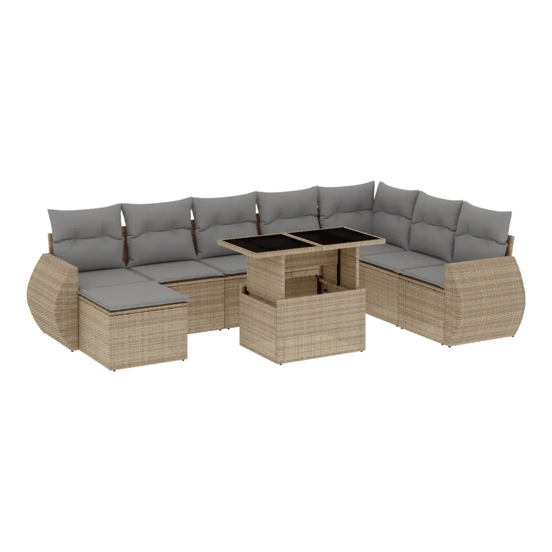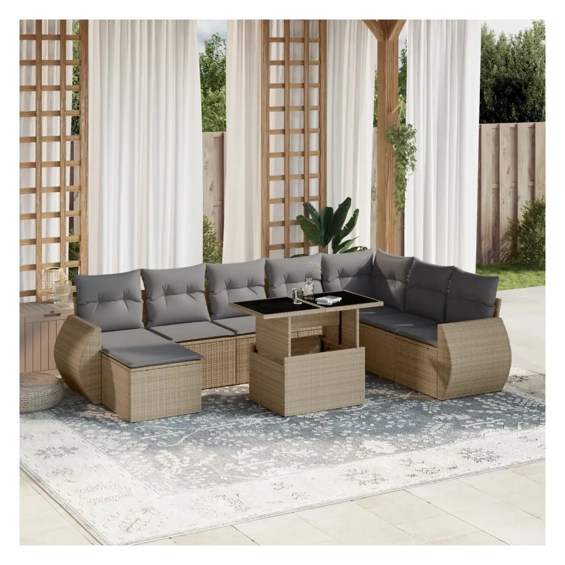 Cet ensemble de canapés de jardin est le complément parfait de votre arrière-cour, terrasse ou patio, offrant un espace confortable et accueillant pour discuter avec la famille et les amis ou simplement se détendre et profiter de l'extérieur. Matériau durable : la résine tressée, également connue sous le nom de poly rotin, est un matériau synthétique solide et nécessitant peu d'entretien qui ressemble au rotin naturel. Il est léger, facile à nettoyer et couramment utilisé pour les meubles d'extérieur en raison de sa durabilité et de ses propriétés de résistance aux intempéries.Dessus de table réglable : le dessus de table peut être soulevé pour rendre la table plus haute, ce qui transforme la table d'extérieur d'une table basse à une table de salle à manger. Elle est parfaite pour recevoir des invités ou prendre des repas à l'extérieur.Expérience d'assise confortable : ce mobilier d'extérieur, doté de coussins épais, offre une expérience d'assise confortable.Housse amovible et lavable : ces coussins de siège sont dotés de housses amovibles pour un lavage et un entretien faciles.Conception modulaire : cet ensemble de meubles d'extérieur a une conception modulaire, ce qui le rend complètement flexible et facile à déplacer, afin que vous puissiez créer un agencement de meubles d'extérieur personnalisé. Bon à savoir :Pour que vos meubles d'extérieur restent beaux, nous vous recommandons de les protéger avec une housse imperméable.
