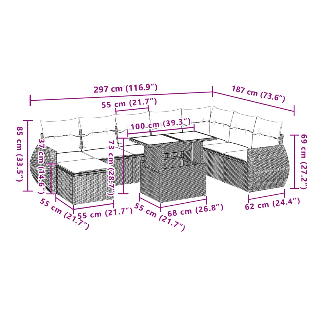 - Dimensions du coussin de dossier : 55 x 45 x 13 cm (L x l x é)