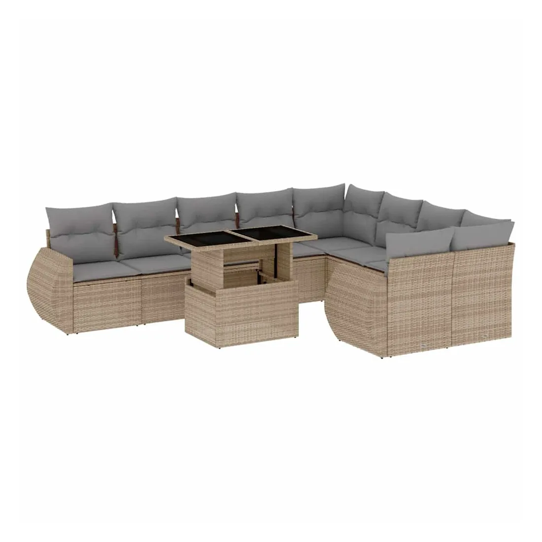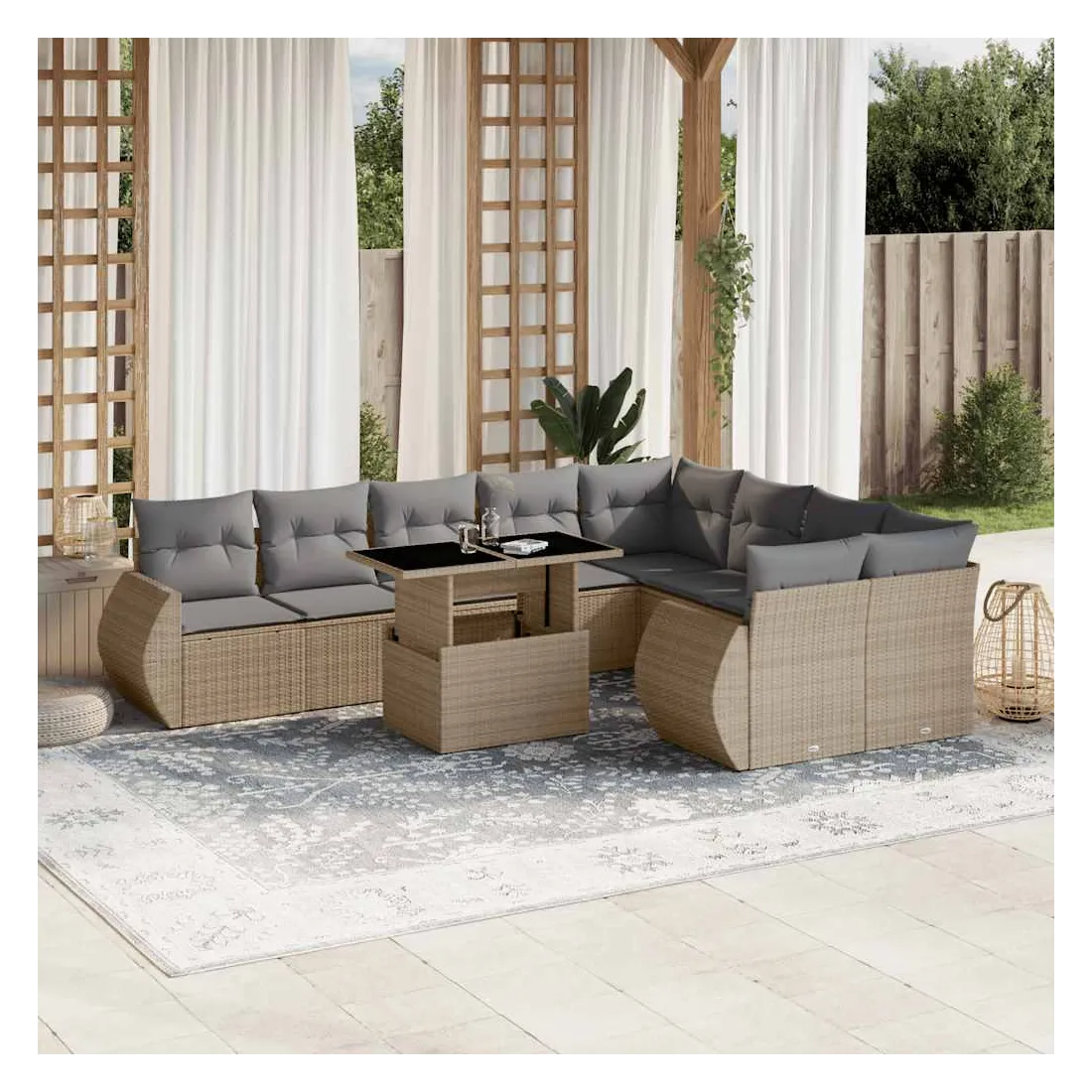Cet ensemble de canapés de jardin est le complément parfait de votre arrière-cour, terrasse ou patio, offrant un espace confortable et accueillant pour discuter avec la famille et les amis ou simplement se détendre et profiter de l'extérieur. Matériau durable : la résine tressée, également connue sous le nom de poly rotin, est un matériau synthétique solide et nécessitant peu d'entretien qui ressemble au rotin naturel. Il est léger, facile à nettoyer et couramment utilisé pour les meubles d'extérieur en raison de sa durabilité et de ses propriétés de résistance aux intempéries.Dessus de table réglable : le dessus de table peut être soulevé pour rendre la table plus haute, ce qui transforme la table d'extérieur d'une table basse à une table de salle à manger. Elle est parfaite pour recevoir des invités ou prendre des repas à l'extérieur.Expérience d'assise confortable : ce mobilier d'extérieur, doté de coussins épais, offre une expérience d'assise confortable.Housse amovible et lavable : ces coussins de siège sont dotés de housses amovibles pour un lavage et un entretien faciles.Conception modulaire : cet ensemble de meubles d'extérieur a une conception modulaire, ce qui le rend complètement flexible et facile à déplacer, afin que vous puissiez créer un agencement de meubles d'extérieur personnalisé. Bon à savoir :Pour que vos meubles d'extérieur restent beaux, nous vous recommandons de les protéger avec une housse imperméable.