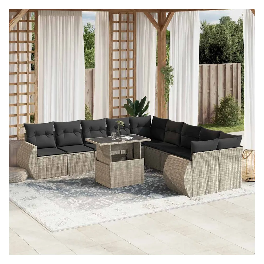 Cet ensemble de canapés de jardin est le complément parfait de votre arrière-cour, terrasse ou patio, offrant un espace confortable et accueillant pour discuter avec la famille et les amis ou simplement se détendre et profiter de l'extérieur. Matériau durable : la résine tressée, également connue sous le nom de poly rotin, est un matériau synthétique solide et nécessitant peu d'entretien qui ressemble au rotin naturel. Elle est légère, facile à nettoyer et couramment utilisée pour les meubles d'extérieur en raison de sa durabilité et de ses propriétés de résistance aux intempéries.Dessus de table réglable : le dessus de table peut être soulevé pour rendre la table plus haute, ce qui transforme la table d'extérieur d'une table basse à une table de salle à manger. Elle est parfaite pour recevoir des invités ou prendre des repas à l'extérieur.Expérience d'assise confortable : ce mobilier d'extérieur, doté de coussins épais, offre une expérience d'assise confortable.Housse amovible et lavable : ces coussins de siège sont dotés de housses amovibles pour un lavage et un entretien faciles.Conception modulaire : cet ensemble de meubles d'extérieur a une conception modulaire, ce qui le rend complètement flexible et facile à déplacer, afin que vous puissiez créer un agencement de meubles d'extérieur personnalisé. Bon à savoir :Pour que vos meubles d'extérieur restent beaux, nous vous recommandons de les protéger avec une housse imperméable.