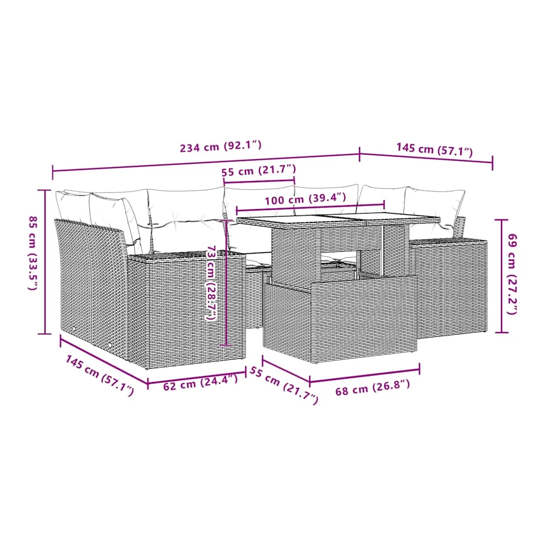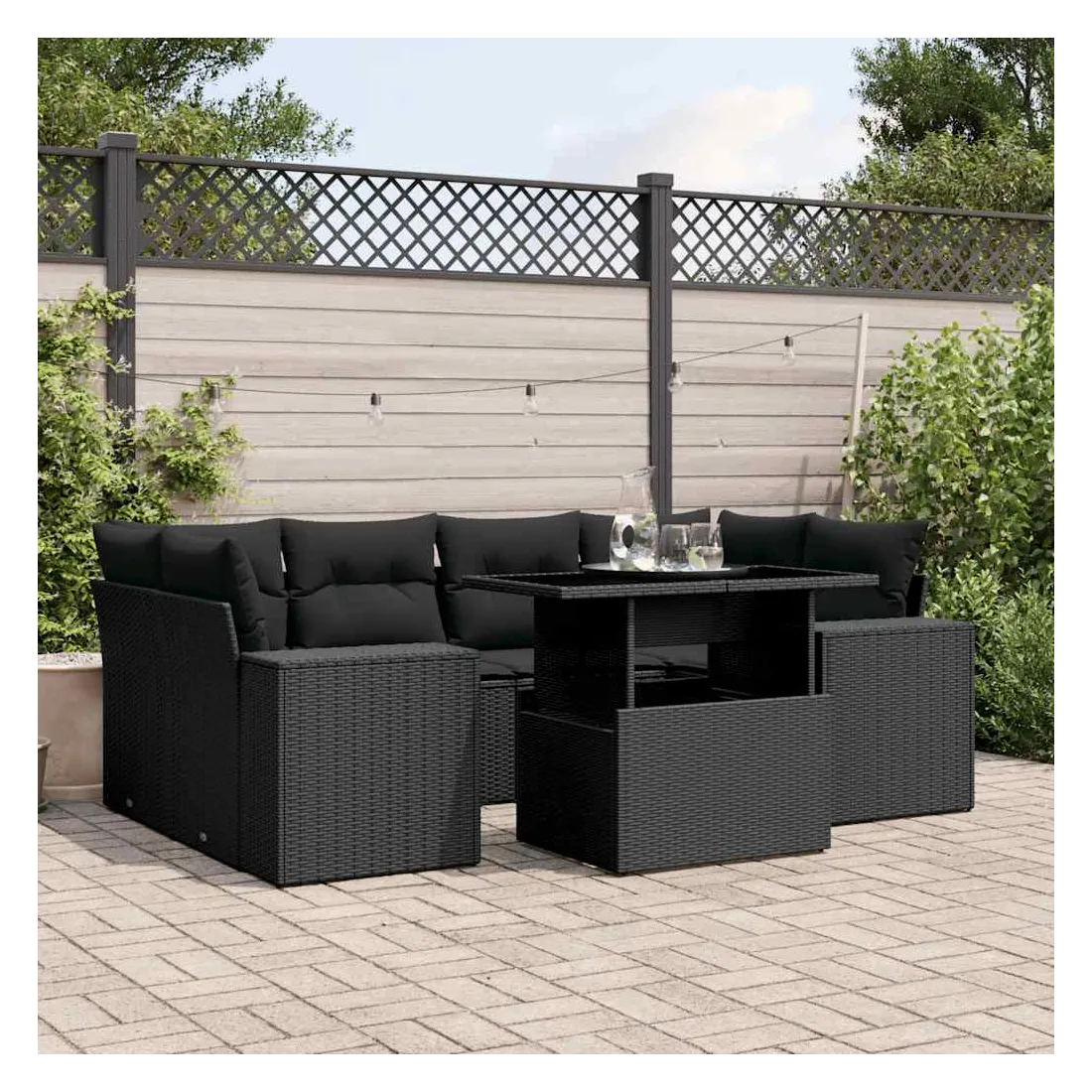 Cet ensemble de canapés de jardin est le complément parfait de votre arrière-cour, terrasse ou patio, offrant un espace confortable et accueillant pour discuter avec la famille et les amis ou simplement se détendre et profiter de l'extérieur. Matériau durable : la résine tressée, également connue sous le nom de poly rotin, est un matériau synthétique solide et nécessitant peu d'entretien qui ressemble au rotin naturel. Il est léger, facile à nettoyer et couramment utilisé pour les meubles d'extérieur en raison de sa durabilité et de ses propriétés de résistance aux intempéries.Dessus de table réglable : le dessus de table peut être soulevé pour rendre la table plus haute, ce qui transforme la table d'extérieur d'une table basse à une table de salle à manger. Elle est parfaite pour recevoir des invités ou prendre des repas à l'extérieur.Expérience d'assise confortable : ce mobilier d'extérieur, doté de coussins épais, offre une expérience d'assise confortable.Housse amovible et lavable : ces coussins de siège sont dotés de housses amovibles pour un lavage et un entretien faciles.Conception modulaire : cet ensemble de meubles d'extérieur a une conception modulaire, ce qui le rend complètement flexible et facile à déplacer, afin que vous puissiez créer un agencement de meubles d'extérieur personnalisé. Bon à savoir :Pour que vos meubles d'extérieur restent beaux, nous vous recommandons de les protéger avec une housse imperméable.