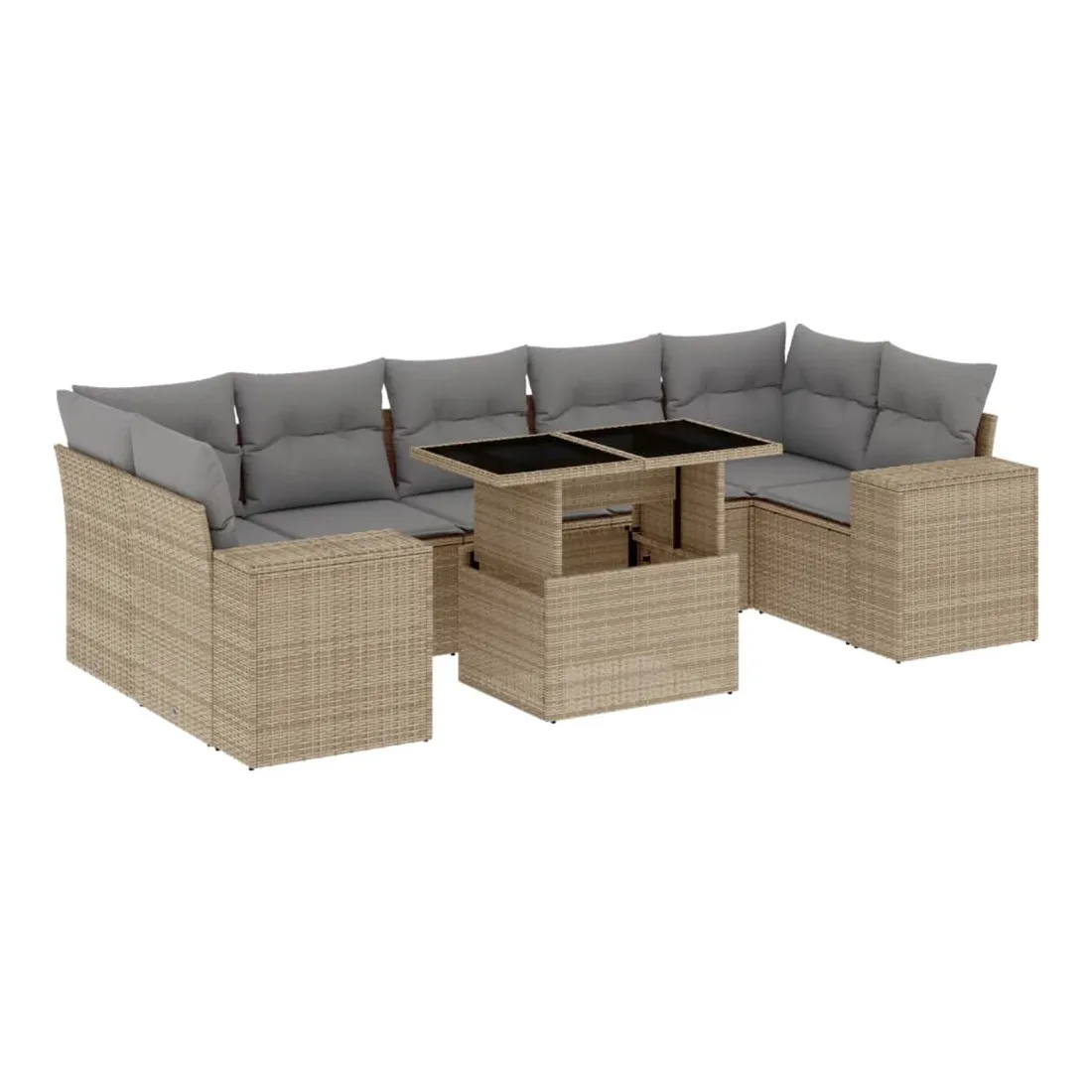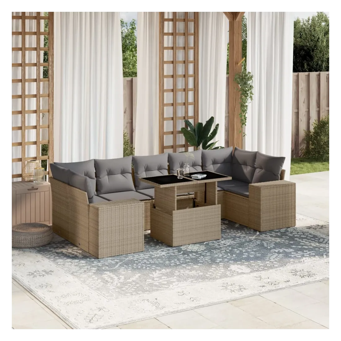 Cet ensemble de canapés de jardin est le complément parfait de votre arrière-cour, terrasse ou patio, offrant un espace confortable et accueillant pour discuter avec la famille et les amis ou simplement se détendre et profiter de l'extérieur. Matériau durable : la résine tressée, également connue sous le nom de poly rotin, est un matériau synthétique solide et nécessitant peu d'entretien qui ressemble au rotin naturel. Il est léger, facile à nettoyer et couramment utilisé pour les meubles d'extérieur en raison de sa durabilité et de ses propriétés de résistance aux intempéries.Dessus de table réglable : le dessus de table peut être soulevé pour rendre la table plus haute, ce qui transforme la table d'extérieur d'une table basse à une table de salle à manger. Elle est parfaite pour recevoir des invités ou prendre des repas à l'extérieur.Expérience d'assise confortable : ce mobilier d'extérieur, doté de coussins épais, offre une expérience d'assise confortable.Housse amovible et lavable : ces coussins de siège sont dotés de housses amovibles pour un lavage et un entretien faciles.Conception modulaire : cet ensemble de meubles d'extérieur a une conception modulaire, ce qui le rend complètement flexible et facile à déplacer, afin que vous puissiez créer un agencement de meubles d'extérieur personnalisé. Bon à savoir :Pour que vos meubles d'extérieur restent beaux, nous vous recommandons de les protéger avec une housse imperméable.