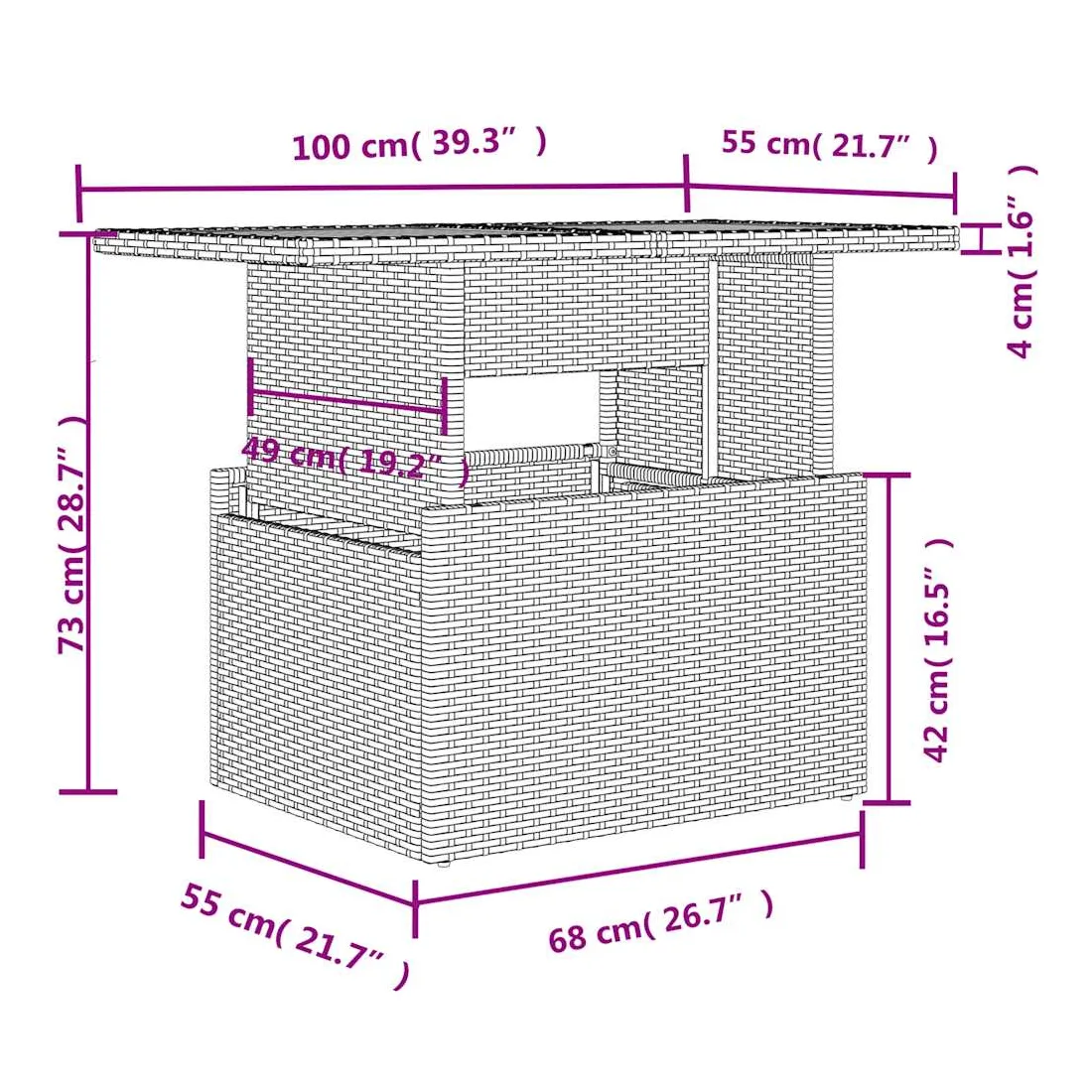 - Matériau : résine tressée, acier enduit de poudre, verre trempé