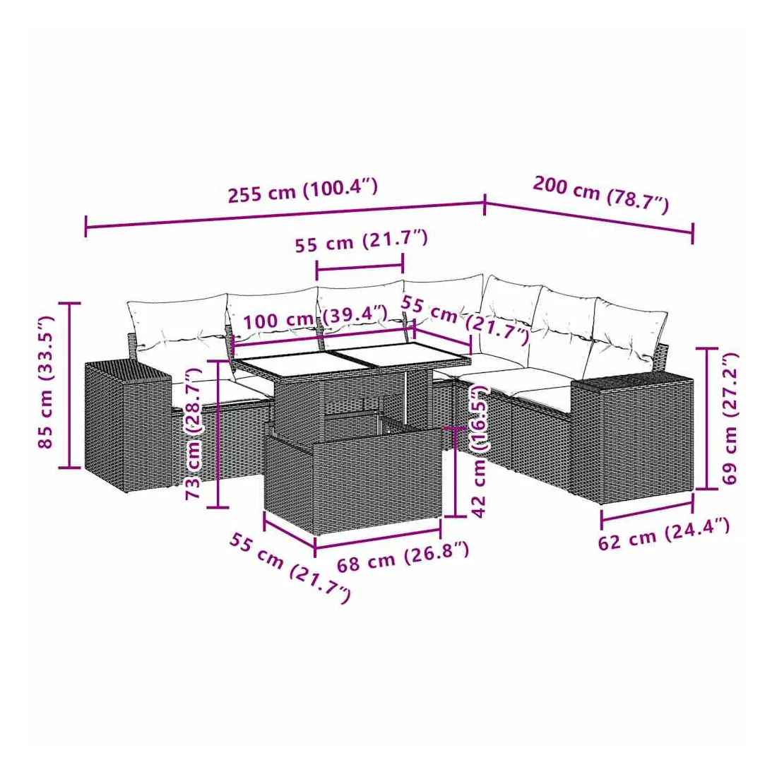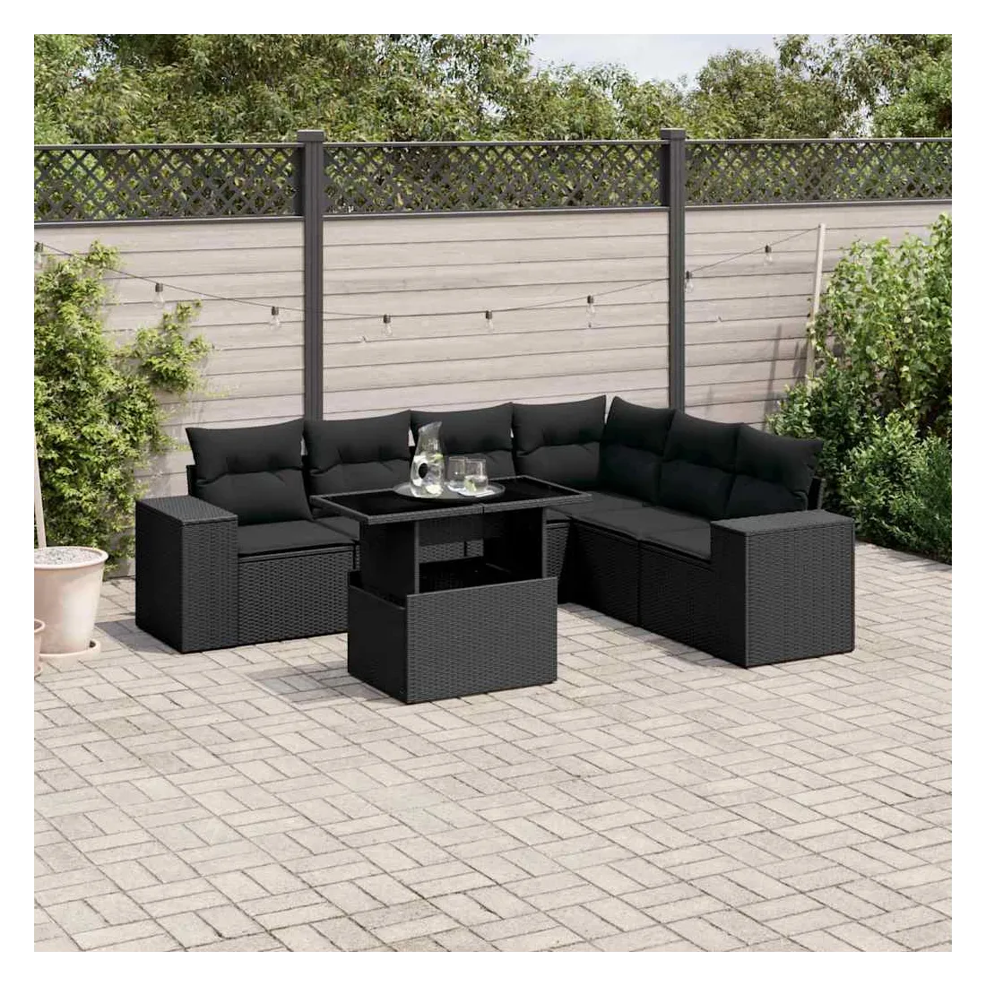 Cet ensemble de canapés de jardin est le complément parfait de votre arrière-cour, terrasse ou patio, offrant un espace confortable et accueillant pour discuter avec la famille et les amis ou simplement se détendre et profiter de l'extérieur. Matériau durable : la résine tressée, également connue sous le nom de poly rotin, est un matériau synthétique solide et nécessitant peu d'entretien qui ressemble au rotin naturel. Il est léger, facile à nettoyer et couramment utilisé pour les meubles d'extérieur en raison de sa durabilité et de ses propriétés de résistance aux intempéries.Dessus de table réglable : le dessus de table peut être soulevé pour rendre la table plus haute, ce qui transforme la table d'extérieur d'une table basse à une table de salle à manger. Elle est parfaite pour recevoir des invités ou prendre des repas à l'extérieur.Expérience d'assise confortable : ce mobilier d'extérieur, doté de coussins épais, offre une expérience d'assise confortable.Housse amovible et lavable : ces coussins de siège sont dotés de housses amovibles pour un lavage et un entretien faciles.Conception modulaire : cet ensemble de meubles d'extérieur a une conception modulaire, ce qui le rend complètement flexible et facile à déplacer, afin que vous puissiez créer un agencement de meubles d'extérieur personnalisé. Bon à savoir :Pour que vos meubles d'extérieur restent beaux, nous vous recommandons de les protéger avec une housse imperméable.