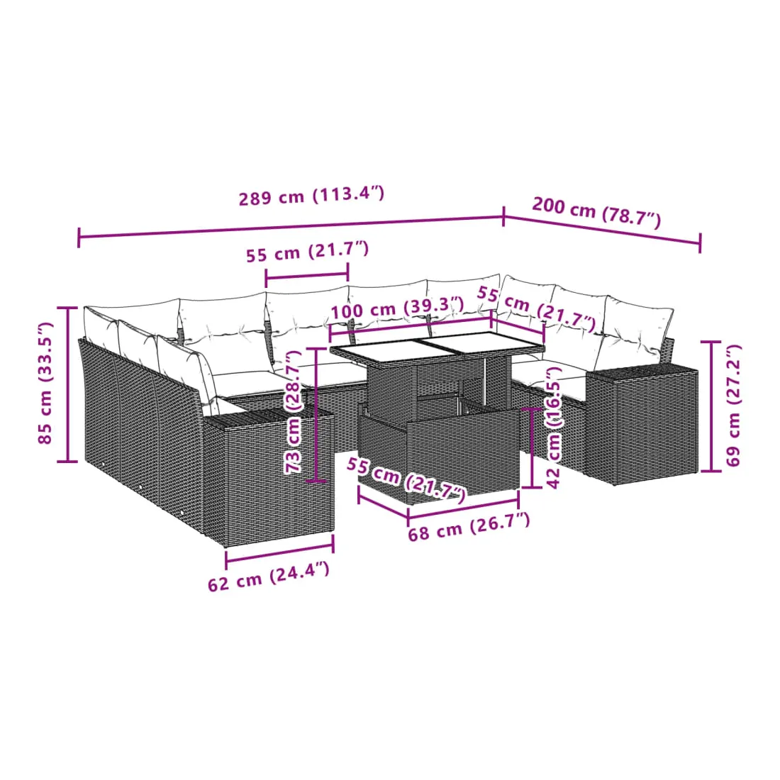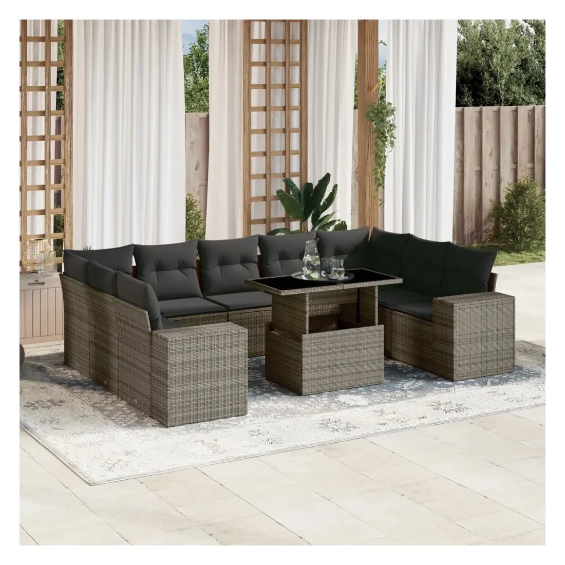 Cet ensemble de canapés de jardin est le complément parfait de votre arrière-cour, terrasse ou patio, offrant un espace confortable et accueillant pour discuter avec la famille et les amis ou simplement se détendre et profiter de l'extérieur. Matériau durable : la résine tressée, également connue sous le nom de poly rotin, est un matériau synthétique solide et nécessitant peu d'entretien qui ressemble au rotin naturel. Il est léger, facile à nettoyer et couramment utilisé pour les meubles d'extérieur en raison de sa durabilité et de ses propriétés de résistance aux intempéries.Dessus de table réglable : le dessus de table peut être soulevé pour rendre la table plus haute, ce qui transforme la table d'extérieur d'une table basse à une table de salle à manger. Elle est parfaite pour recevoir des invités ou prendre des repas à l'extérieur.Expérience d'assise confortable : ce mobilier d'extérieur, doté de coussins épais, offre une expérience d'assise confortable.Housse amovible et lavable : ces coussins de siège sont dotés de housses amovibles pour un lavage et un entretien faciles.Conception modulaire : cet ensemble de meubles d'extérieur a une conception modulaire, ce qui le rend complètement flexible et facile à déplacer, afin que vous puissiez créer un agencement de meubles d'extérieur personnalisé. Bon à savoir :Pour que vos meubles d'extérieur restent beaux, nous vous recommandons de les protéger avec une housse imperméable.