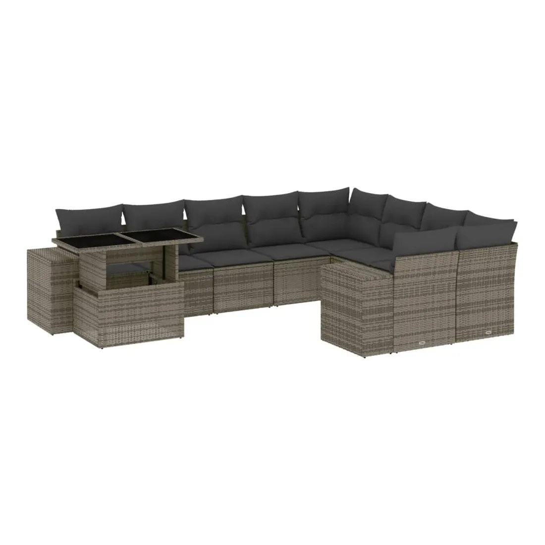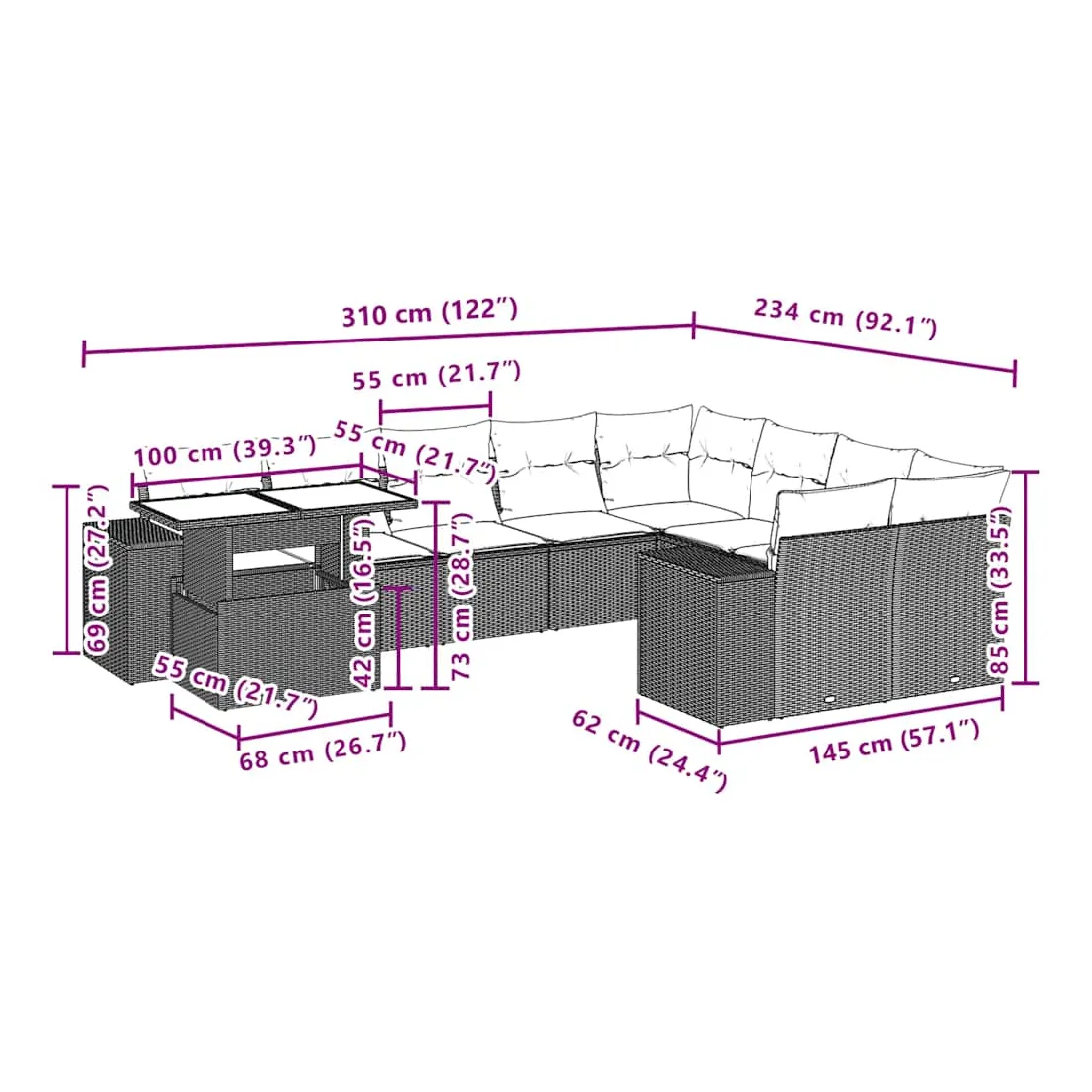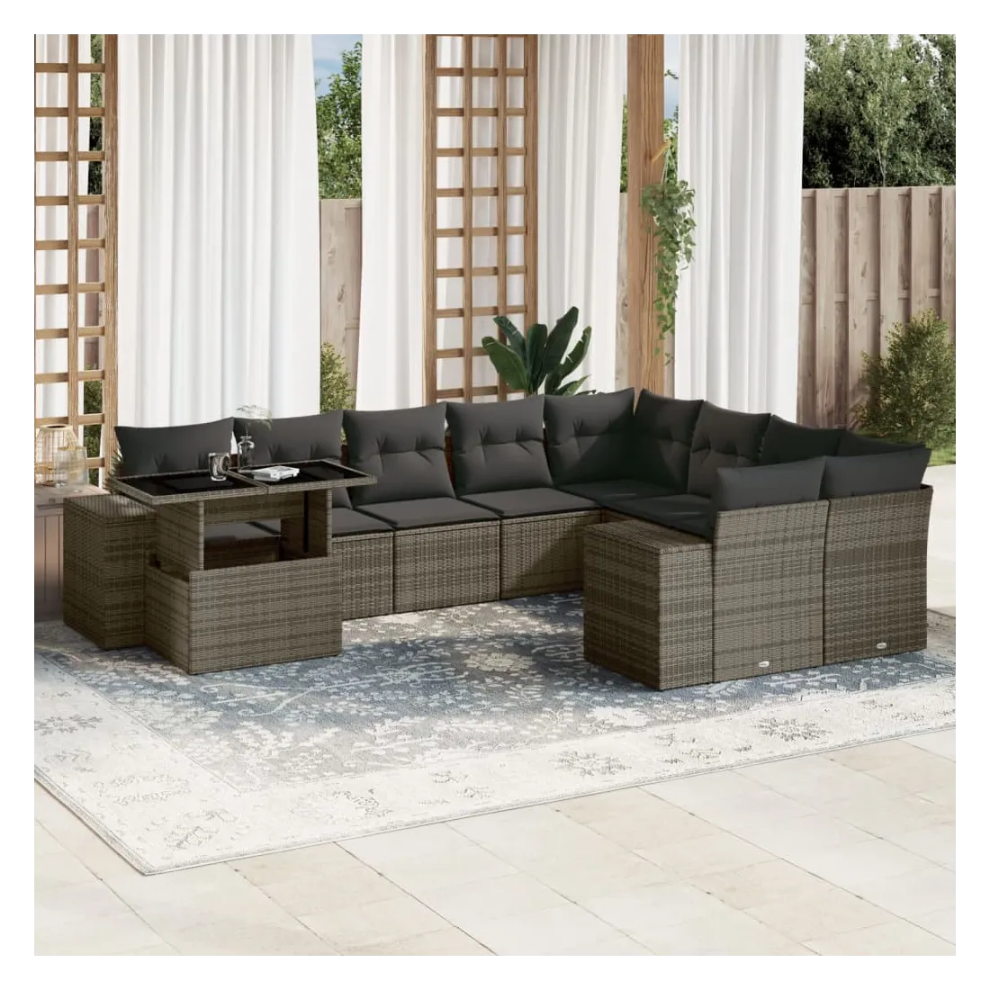 Cet ensemble de canapés de jardin est le complément parfait de votre arrière-cour, terrasse ou patio, offrant un espace confortable et accueillant pour discuter avec la famille et les amis ou simplement se détendre et profiter de l'extérieur. Matériau durable : la résine tressée, également connue sous le nom de poly rotin, est un matériau synthétique solide et nécessitant peu d'entretien qui ressemble au rotin naturel. Il est léger, facile à nettoyer et couramment utilisé pour les meubles d'extérieur en raison de sa durabilité et de ses propriétés de résistance aux intempéries.Dessus de table réglable : le dessus de table peut être soulevé pour rendre la table plus haute, ce qui transforme la table d'extérieur d'une table basse à une table de salle à manger. Elle est parfaite pour recevoir des invités ou prendre des repas à l'extérieur.Expérience d'assise confortable : ce mobilier d'extérieur, doté de coussins épais, offre une expérience d'assise confortable.Housse amovible et lavable : ces coussins de siège sont dotés de housses amovibles pour un lavage et un entretien faciles.Conception modulaire : cet ensemble de meubles d'extérieur a une conception modulaire, ce qui le rend complètement flexible et facile à déplacer, afin que vous puissiez créer un agencement de meubles d'extérieur personnalisé. Bon à savoir :Pour que vos meubles d'extérieur restent beaux, nous vous recommandons de les protéger avec une housse imperméable.