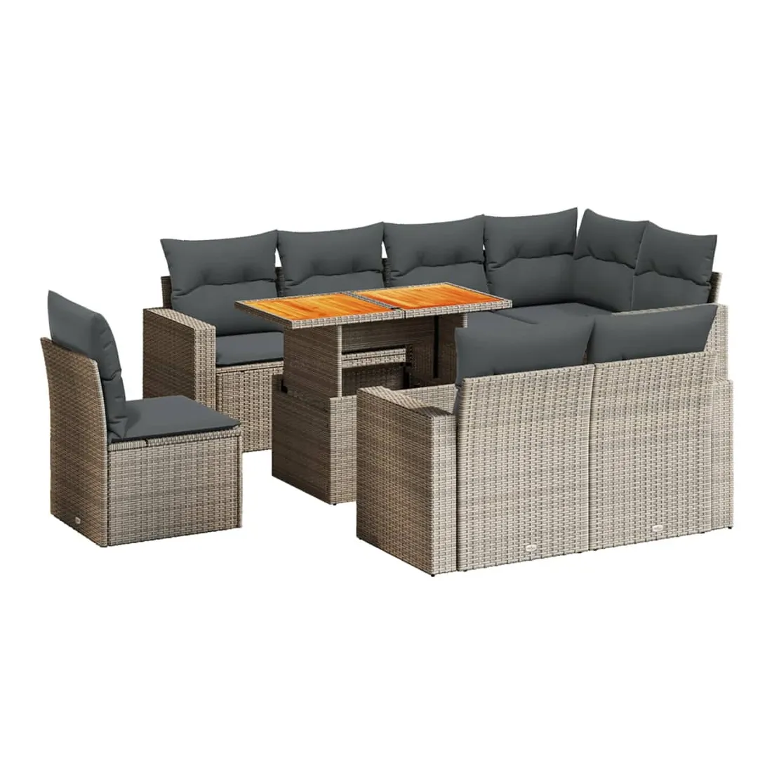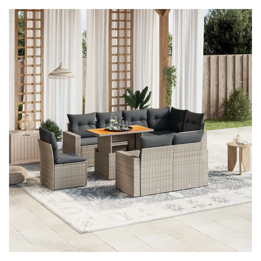 Cet ensemble de canapés de jardin est le complément parfait de votre arrière-cour, terrasse ou patio, offrant un espace confortable et accueillant pour discuter avec la famille et les amis ou simplement se détendre et profiter de l'extérieur. Matériau durable : la résine tressée, également connue sous le nom de poly rotin, est un matériau synthétique solide et nécessitant peu d'entretien qui ressemble au rotin naturel. Il est léger, facile à nettoyer et couramment utilisé pour les meubles d'extérieur en raison de sa durabilité et de ses propriétés de résistance aux intempéries.Dessus de table réglable : le dessus de table peut être soulevé pour rendre la table plus haute, ce qui transforme la table d'extérieur d'une table basse à une table de salle à manger. Elle est parfaite pour recevoir des invités ou prendre des repas à l'extérieur.Expérience d'assise confortable : ce mobilier d'extérieur, doté de coussins épais, offre une expérience d'assise confortable.Housse amovible et lavable : ces coussins de siège sont dotés de housses amovibles pour un lavage et un entretien faciles.Conception modulaire : cet ensemble de meubles d'extérieur a une conception modulaire, ce qui le rend complètement flexible et facile à déplacer, afin que vous puissiez créer un agencement de meubles d'extérieur personnalisé. Bon à savoir :Pour que vos meubles d'extérieur restent beaux, nous vous recommandons de les protéger avec une housse imperméable.