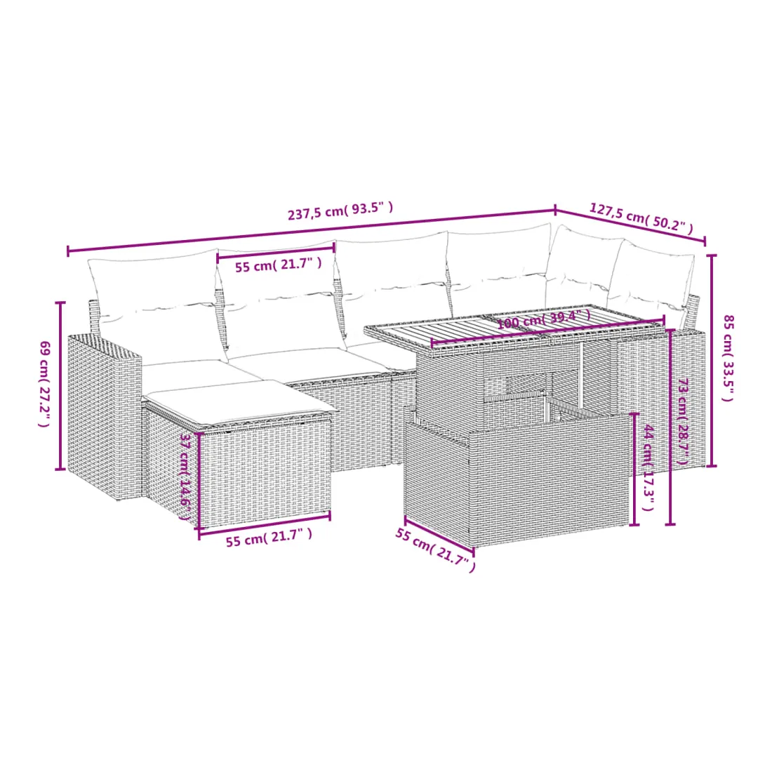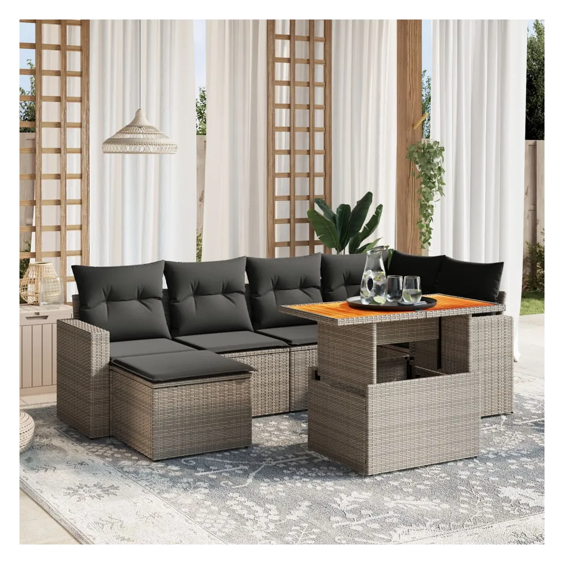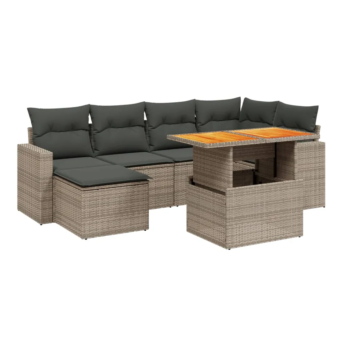 Cet ensemble de canapés de jardin est le complément parfait de votre arrière-cour, terrasse ou patio, offrant un espace confortable et accueillant pour discuter avec la famille et les amis ou simplement se détendre et profiter de l'extérieur. Matériau durable : la résine tressée, également connue sous le nom de poly rotin, est un matériau synthétique solide et nécessitant peu d'entretien qui ressemble au rotin naturel. Il est léger, facile à nettoyer et couramment utilisé pour les meubles d'extérieur en raison de sa durabilité et de ses propriétés de résistance aux intempéries.Dessus de table réglable : le dessus de table peut être soulevé pour rendre la table plus haute, ce qui transforme la table d'extérieur d'une table basse à une table de salle à manger. Elle est parfaite pour recevoir des invités ou prendre des repas à l'extérieur.Expérience d'assise confortable : ce mobilier d'extérieur, doté de coussins épais, offre une expérience d'assise confortable.Housse amovible et lavable : ces coussins de siège sont dotés de housses amovibles pour un lavage et un entretien faciles.Conception modulaire : cet ensemble de meubles d'extérieur a une conception modulaire, ce qui le rend complètement flexible et facile à déplacer, afin que vous puissiez créer un agencement de meubles d'extérieur personnalisé. Bon à savoir :Pour que vos meubles d'extérieur restent beaux, nous vous recommandons de les protéger avec une housse imperméable.