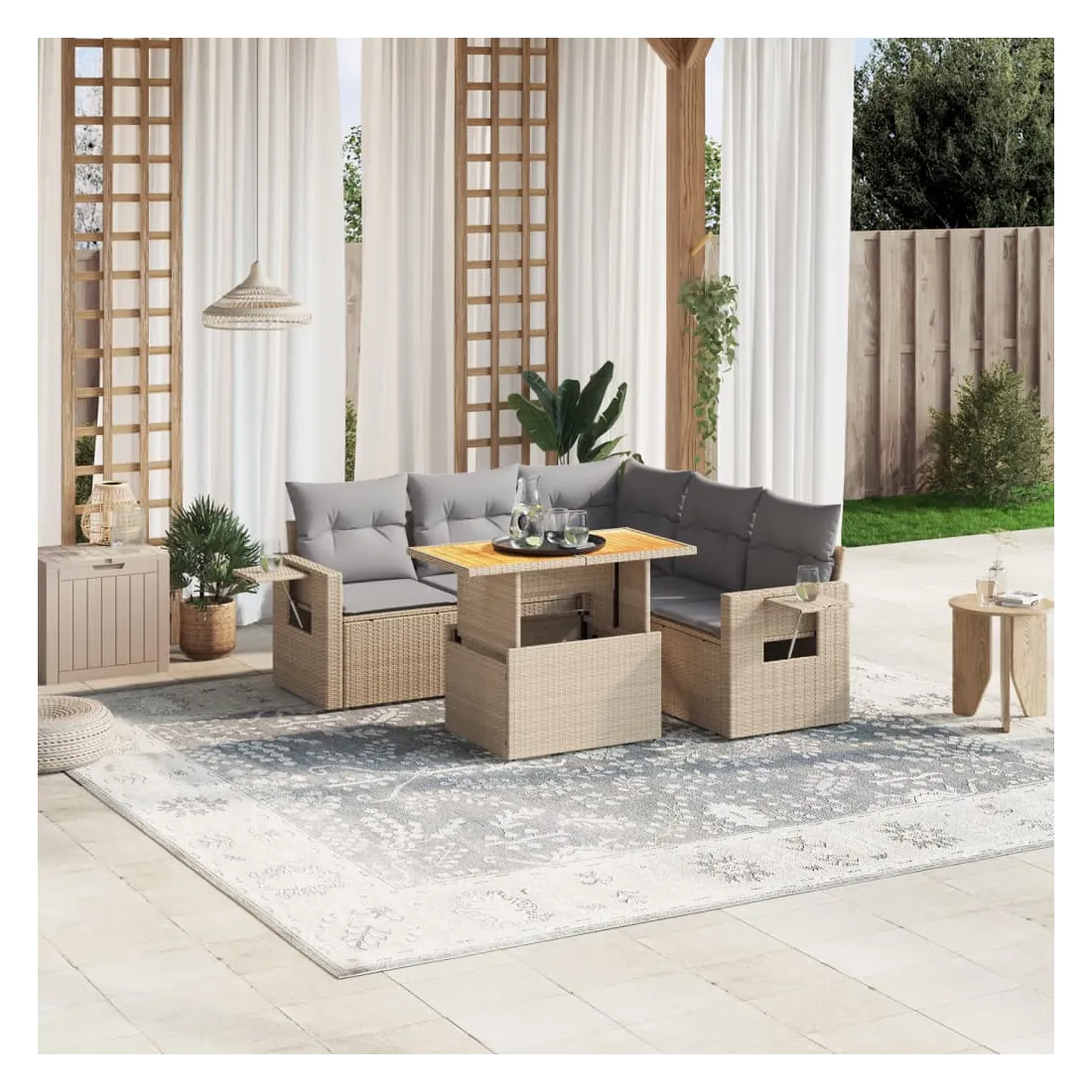 Cet ensemble de canapés de jardin est le complément parfait de votre arrière-cour, terrasse ou patio, offrant un espace confortable et accueillant pour discuter avec la famille et les amis ou simplement se détendre et profiter de l'extérieur. Matériau durable : la résine tressée, également connue sous le nom de poly rotin, est un matériau synthétique solide et nécessitant peu d'entretien qui ressemble au rotin naturel. Il est léger, facile à nettoyer et couramment utilisé pour les meubles d'extérieur en raison de sa durabilité et de ses propriétés de résistance aux intempéries.Dessus de table réglable : le dessus de table peut être soulevé pour rendre la table plus haute, ce qui transforme la table d'extérieur d'une table basse à une table de salle à manger. Elle est parfaite pour recevoir des invités ou prendre des repas à l'extérieur.Table d'appoint pratique : ce mobilier d'extérieur comprend une table d'appoint pliable avec un ressort à gaz sur les accoudoirs, offrant un endroit pratique pour garder vos essentiels à portée de main.Housse amovible et lavable : ces coussins de siège sont dotés de housses amovibles pour un lavage et un entretien faciles.Conception modulaire : cet ensemble de meubles d'extérieur a une conception modulaire, ce qui le rend complètement flexible et facile à déplacer, afin que vous puissiez créer un agencement de meubles d'extérieur personnalisé. Bon à savoir :Pour que vos meubles d'extérieur restent beaux, nous vous recommandons de les protéger avec une housse imperméable.