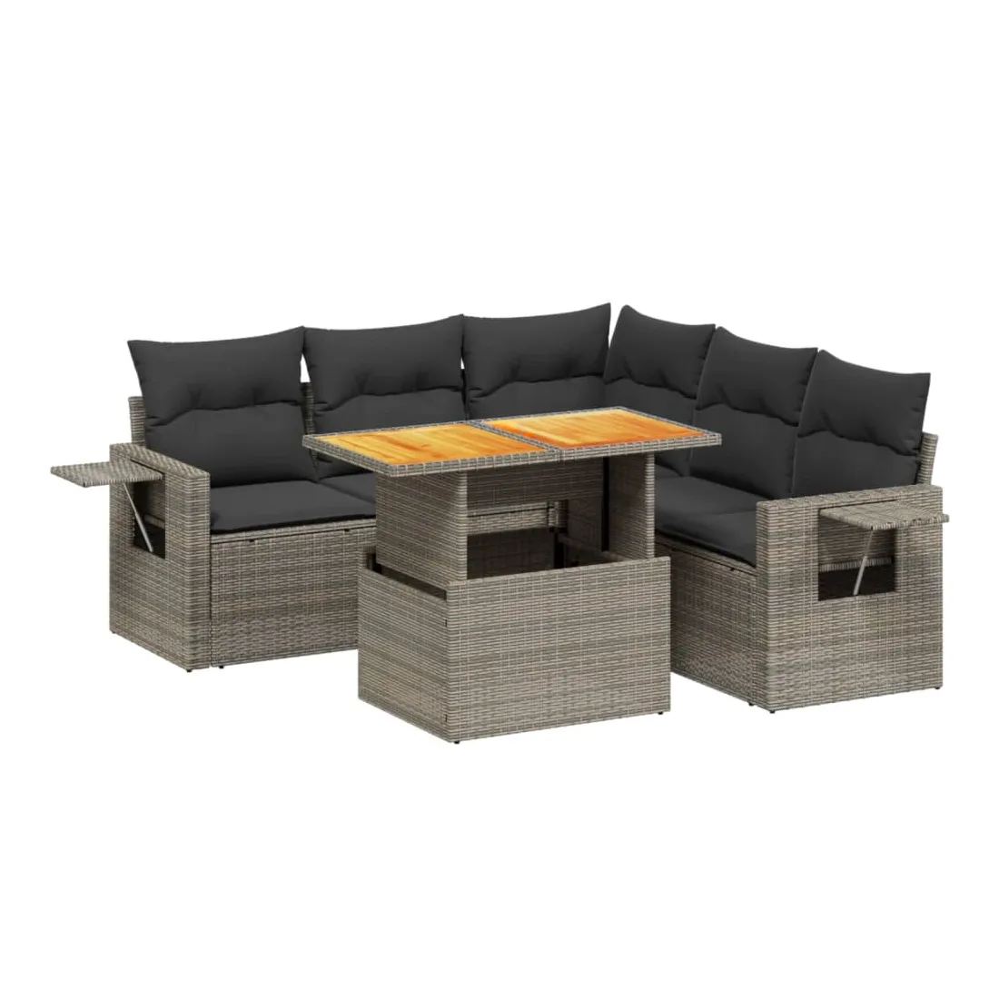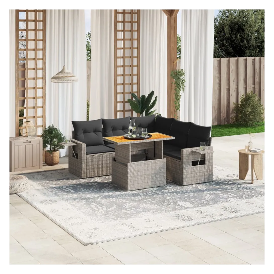 Cet ensemble de canapés de jardin est le complément parfait de votre arrière-cour, terrasse ou patio, offrant un espace confortable et accueillant pour discuter avec la famille et les amis ou simplement se détendre et profiter de l'extérieur. Matériau durable : la résine tressée, également connue sous le nom de poly rotin, est un matériau synthétique solide et nécessitant peu d'entretien qui ressemble au rotin naturel. Il est léger, facile à nettoyer et couramment utilisé pour les meubles d'extérieur en raison de sa durabilité et de ses propriétés de résistance aux intempéries.Dessus de table réglable : le dessus de table peut être soulevé pour rendre la table plus haute, ce qui transforme la table d'extérieur d'une table basse à une table de salle à manger. Elle est parfaite pour recevoir des invités ou prendre des repas à l'extérieur.Table d'appoint pratique : ce mobilier d'extérieur comprend une table d'appoint pliable avec un ressort à gaz sur les accoudoirs, offrant un endroit pratique pour garder vos essentiels à portée de main.Housse amovible et lavable : ces coussins de siège sont dotés de housses amovibles pour un lavage et un entretien faciles.Conception modulaire : cet ensemble de meubles d'extérieur a une conception modulaire, ce qui le rend complètement flexible et facile à déplacer, afin que vous puissiez créer un agencement de meubles d'extérieur personnalisé. Bon à savoir :Pour que vos meubles d'extérieur restent beaux, nous vous recommandons de les protéger avec une housse imperméable.