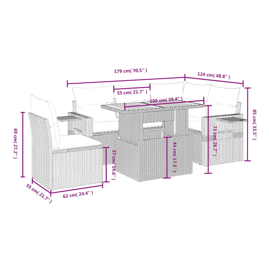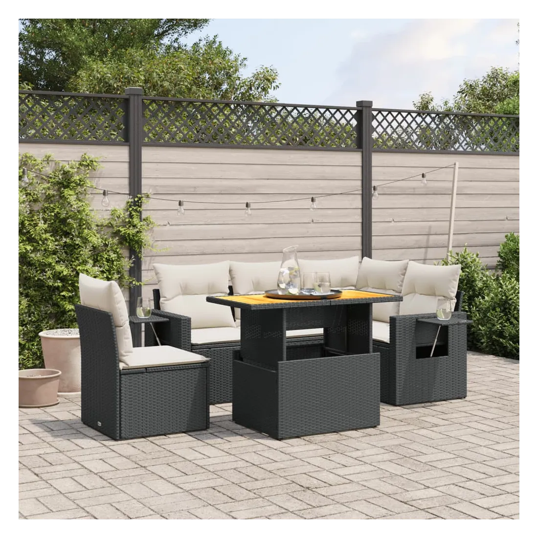 Cet ensemble de canapés de jardin est le complément parfait de votre arrière-cour, terrasse ou patio, offrant un espace confortable et accueillant pour discuter avec la famille et les amis ou simplement se détendre et profiter de l'extérieur. Matériau durable : la résine tressée, également connue sous le nom de poly rotin, est un matériau synthétique solide et nécessitant peu d'entretien qui ressemble au rotin naturel. Il est léger, facile à nettoyer et couramment utilisé pour les meubles d'extérieur en raison de sa durabilité et de ses propriétés de résistance aux intempéries.Dessus de table réglable : le dessus de table peut être soulevé pour rendre la table plus haute, ce qui transforme la table d'extérieur d'une table basse à une table de salle à manger. Elle est parfaite pour recevoir des invités ou prendre des repas à l'extérieur.Table d'appoint pratique : ce mobilier d'extérieur comprend une table d'appoint pliable avec un ressort à gaz sur les accoudoirs, offrant un endroit pratique pour garder vos essentiels à portée de main.Housse amovible et lavable : ces coussins de siège sont dotés de housses amovibles pour un lavage et un entretien faciles.Conception modulaire : cet ensemble de meubles d'extérieur a une conception modulaire, ce qui le rend complètement flexible et facile à déplacer, afin que vous puissiez créer un agencement de meubles d'extérieur personnalisé. Bon à savoir :Pour que vos meubles d'extérieur restent beaux, nous vous recommandons de les protéger avec une housse imperméable.