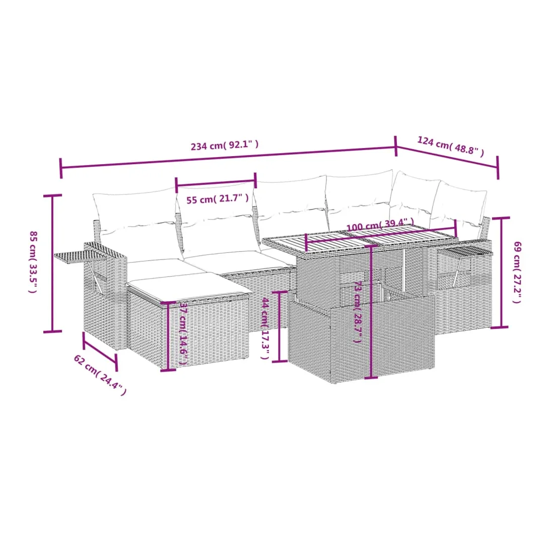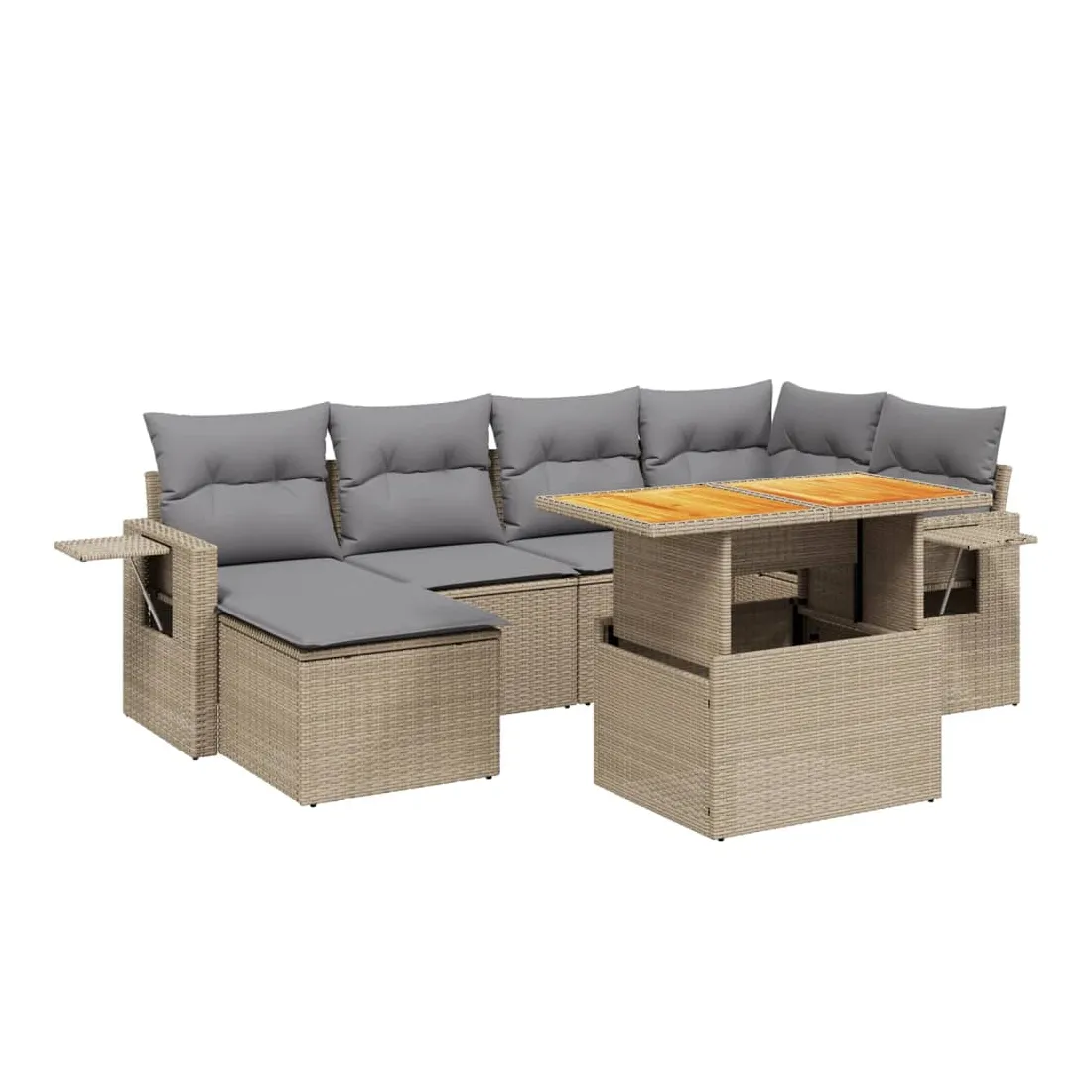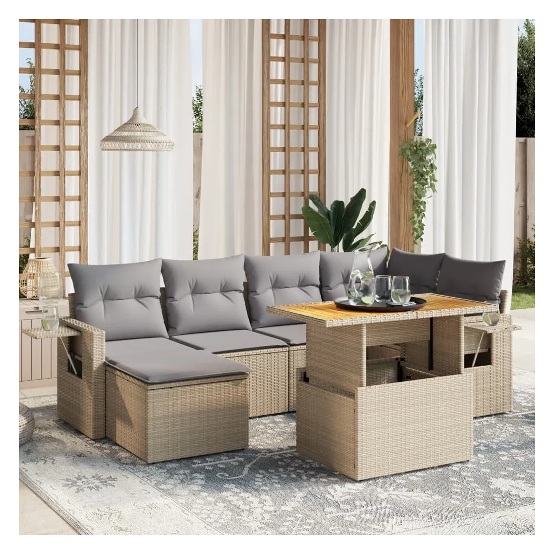 Cet ensemble de canapés de jardin est le complément parfait de votre arrière-cour, terrasse ou patio, offrant un espace confortable et accueillant pour discuter avec la famille et les amis ou simplement se détendre et profiter de l'extérieur. Matériau durable : la résine tressée, également connue sous le nom de poly rotin, est un matériau synthétique solide et nécessitant peu d'entretien qui ressemble au rotin naturel. Il est léger, facile à nettoyer et couramment utilisé pour les meubles d'extérieur en raison de sa durabilité et de ses propriétés de résistance aux intempéries.Dessus de table réglable : le dessus de table peut être soulevé pour rendre la table plus haute, ce qui transforme la table d'extérieur d'une table basse à une table de salle à manger. Elle est parfaite pour recevoir des invités ou prendre des repas à l'extérieur.Table d'appoint pratique : ce mobilier d'extérieur comprend une table d'appoint pliable avec un ressort à gaz sur les accoudoirs, offrant un endroit pratique pour garder vos essentiels à portée de main.Housse amovible et lavable : ces coussins de siège sont dotés de housses amovibles pour un lavage et un entretien faciles.Conception modulaire : cet ensemble de meubles d'extérieur a une conception modulaire, ce qui le rend complètement flexible et facile à déplacer, afin que vous puissiez créer un agencement de meubles d'extérieur personnalisé. Bon à savoir :Pour que vos meubles d'extérieur restent beaux, nous vous recommandons de les protéger avec une housse imperméable.