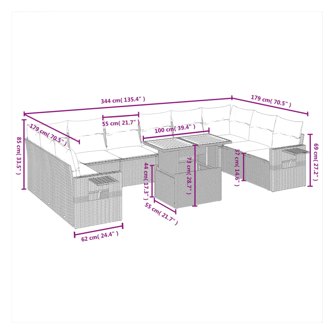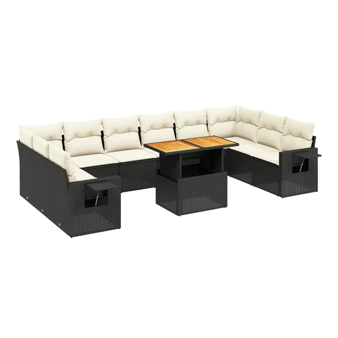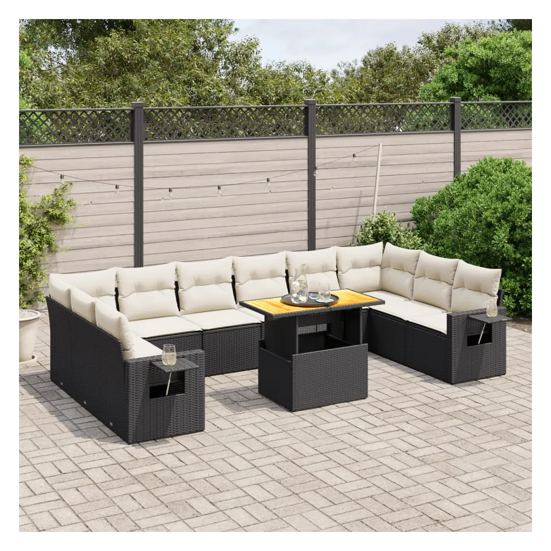 Cet ensemble de canapés de jardin est le complément parfait de votre arrière-cour, terrasse ou patio, offrant un espace confortable et accueillant pour discuter avec la famille et les amis ou simplement se détendre et profiter de l'extérieur. Matériau durable : la résine tressée, également connue sous le nom de poly rotin, est un matériau synthétique solide et nécessitant peu d'entretien qui ressemble au rotin naturel. Il est léger, facile à nettoyer et couramment utilisé pour les meubles d'extérieur en raison de sa durabilité et de ses propriétés de résistance aux intempéries.Dessus de table réglable : le dessus de table peut être soulevé pour rendre la table plus haute, ce qui transforme la table d'extérieur d'une table basse à une table de salle à manger. Elle est parfaite pour recevoir des invités ou prendre des repas à l'extérieur.Table d'appoint pratique : ce mobilier d'extérieur comprend une table d'appoint pliable avec un ressort à gaz sur les accoudoirs, offrant un endroit pratique pour garder vos essentiels à portée de main.Housse amovible et lavable : ces coussins de siège sont dotés de housses amovibles pour un lavage et un entretien faciles.Conception modulaire : cet ensemble de meubles d'extérieur a une conception modulaire, ce qui le rend complètement flexible et facile à déplacer, afin que vous puissiez créer un agencement de meubles d'extérieur personnalisé. Bon à savoir :Pour que vos meubles d'extérieur restent beaux, nous vous recommandons de les protéger avec une housse imperméable.