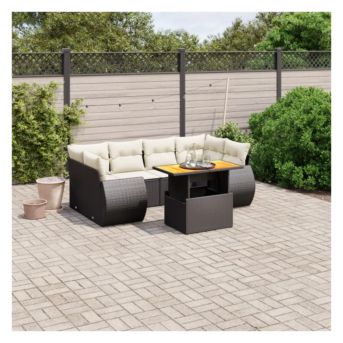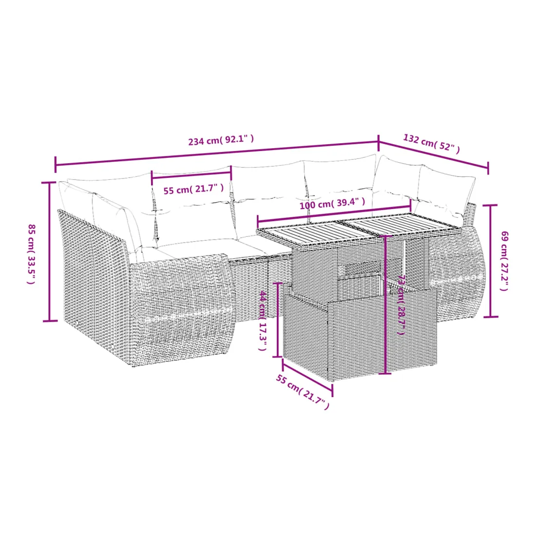 Cet ensemble de canapés de jardin est le complément parfait de votre arrière-cour, terrasse ou patio, offrant un espace confortable et accueillant pour discuter avec la famille et les amis ou simplement se détendre et profiter de l'extérieur. Matériau durable : la résine tressée, également connue sous le nom de poly rotin, est un matériau synthétique solide et nécessitant peu d'entretien qui ressemble au rotin naturel. Il est léger, facile à nettoyer et couramment utilisé pour les meubles d'extérieur en raison de sa durabilité et de ses propriétés de résistance aux intempéries.Dessus de table réglable : le dessus de table peut être soulevé pour rendre la table plus haute, ce qui transforme la table d'extérieur d'une table basse à une table de salle à manger. Elle est parfaite pour recevoir des invités ou prendre des repas à l'extérieur.Expérience d'assise confortable : ce mobilier d'extérieur, doté de coussins épais, offre une expérience d'assise confortable.Housse amovible et lavable : ces coussins de siège sont dotés de housses amovibles pour un lavage et un entretien faciles.Conception modulaire : cet ensemble de meubles d'extérieur a une conception modulaire, ce qui le rend complètement flexible et facile à déplacer, afin que vous puissiez créer un agencement de meubles d'extérieur personnalisé. Bon à savoir :Pour que vos meubles d'extérieur restent beaux, nous vous recommandons de les protéger avec une housse imperméable.