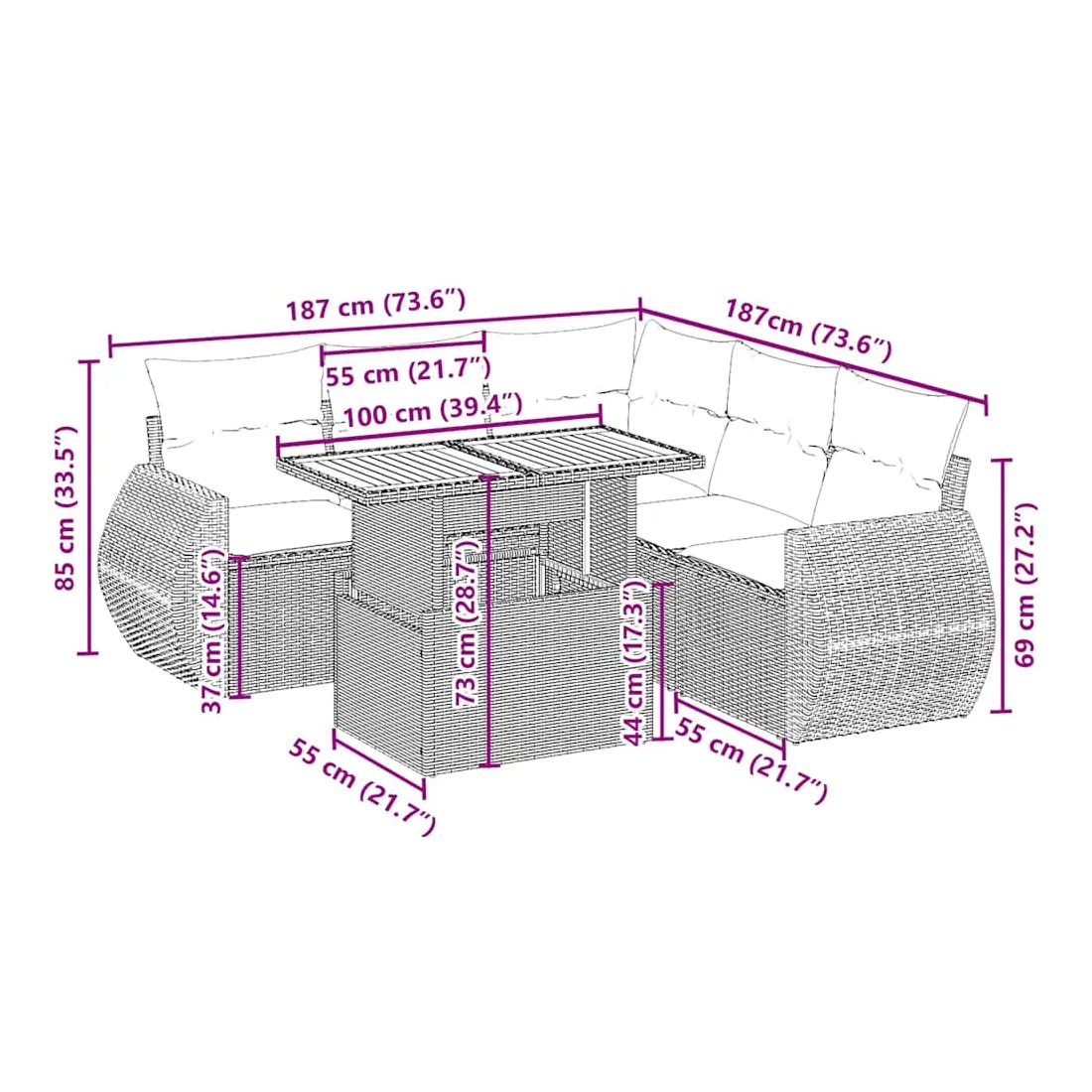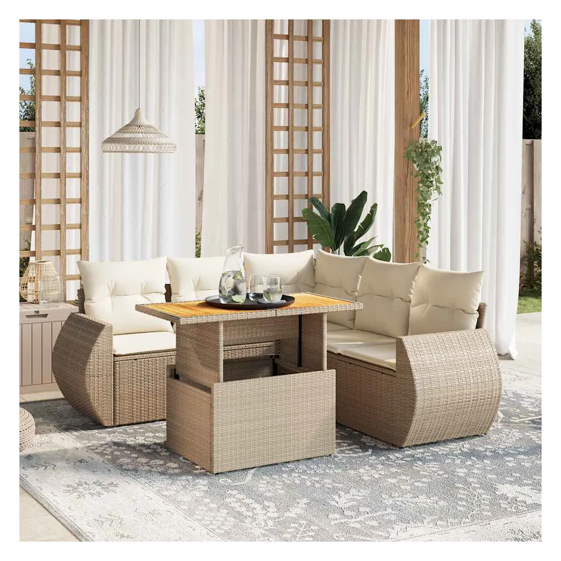 Cet ensemble de canapés de jardin est le complément parfait de votre arrière-cour, terrasse ou patio, offrant un espace confortable et accueillant pour discuter avec la famille et les amis ou simplement se détendre et profiter de l'extérieur. Matériau durable : la résine tressée, également connue sous le nom de poly rotin, est un matériau synthétique solide et nécessitant peu d'entretien qui ressemble au rotin naturel. Il est léger, facile à nettoyer et couramment utilisé pour les meubles d'extérieur en raison de sa durabilité et de ses propriétés de résistance aux intempéries.Dessus de table réglable : le dessus de table peut être soulevé pour rendre la table plus haute, ce qui transforme la table d'extérieur d'une table basse à une table de salle à manger. Elle est parfaite pour recevoir des invités ou prendre des repas à l'extérieur.Expérience d'assise confortable : ce mobilier d'extérieur, doté de coussins épais, offre une expérience d'assise confortable.Housse amovible et lavable : ces coussins de siège sont dotés de housses amovibles pour un lavage et un entretien faciles.Conception modulaire : cet ensemble de meubles d'extérieur a une conception modulaire, ce qui le rend complètement flexible et facile à déplacer, afin que vous puissiez créer un agencement de meubles d'extérieur personnalisé. Bon à savoir :Pour que vos meubles d'extérieur restent beaux, nous vous recommandons de les protéger avec une housse imperméable.