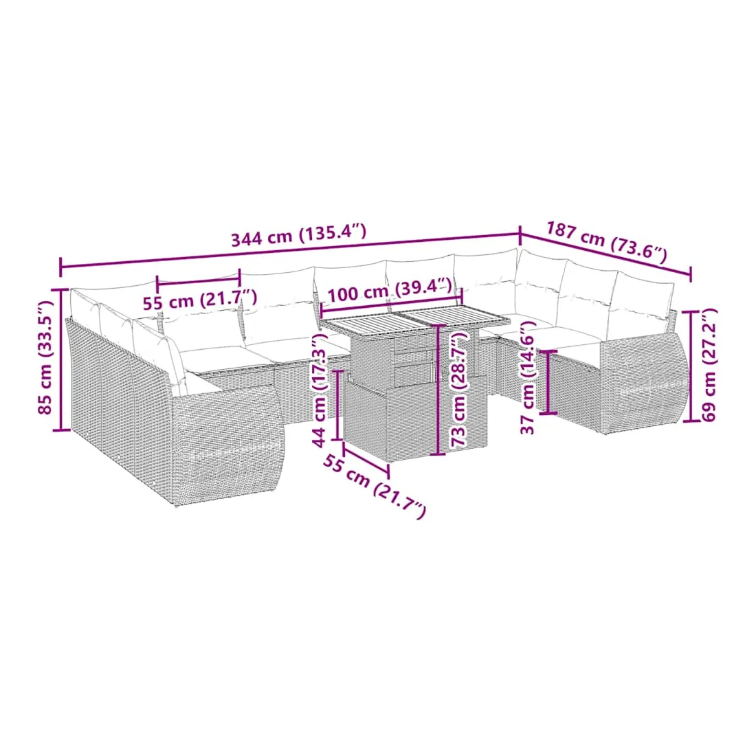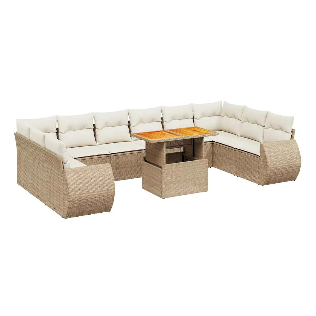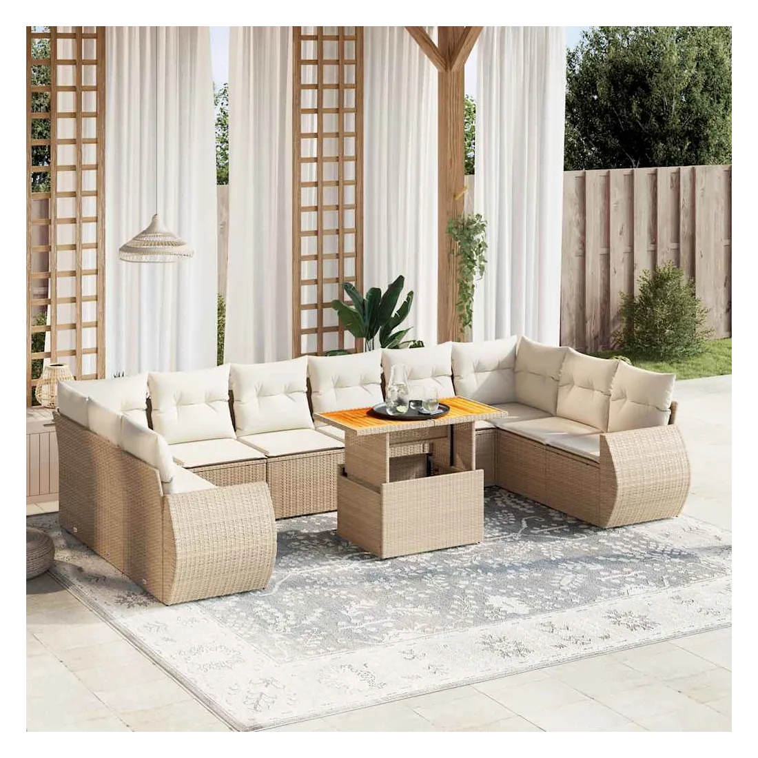 Cet ensemble de canapés de jardin est le complément parfait de votre arrière-cour, terrasse ou patio, offrant un espace confortable et accueillant pour discuter avec la famille et les amis ou simplement se détendre et profiter de l'extérieur. Matériau durable : la résine tressée, également connue sous le nom de poly rotin, est un matériau synthétique solide et nécessitant peu d'entretien qui ressemble au rotin naturel. Il est léger, facile à nettoyer et couramment utilisé pour les meubles d'extérieur en raison de sa durabilité et de ses propriétés de résistance aux intempéries.Dessus de table réglable : le dessus de table peut être soulevé pour rendre la table plus haute, ce qui transforme la table d'extérieur d'une table basse à une table de salle à manger. Elle est parfaite pour recevoir des invités ou prendre des repas à l'extérieur.Expérience d'assise confortable : ce mobilier d'extérieur, doté de coussins épais, offre une expérience d'assise confortable.Housse amovible et lavable : ces coussins de siège sont dotés de housses amovibles pour un lavage et un entretien faciles.Conception modulaire : cet ensemble de meubles d'extérieur a une conception modulaire, ce qui le rend complètement flexible et facile à déplacer, afin que vous puissiez créer un agencement de meubles d'extérieur personnalisé. Bon à savoir :Pour que vos meubles d'extérieur restent beaux, nous vous recommandons de les protéger avec une housse imperméable.