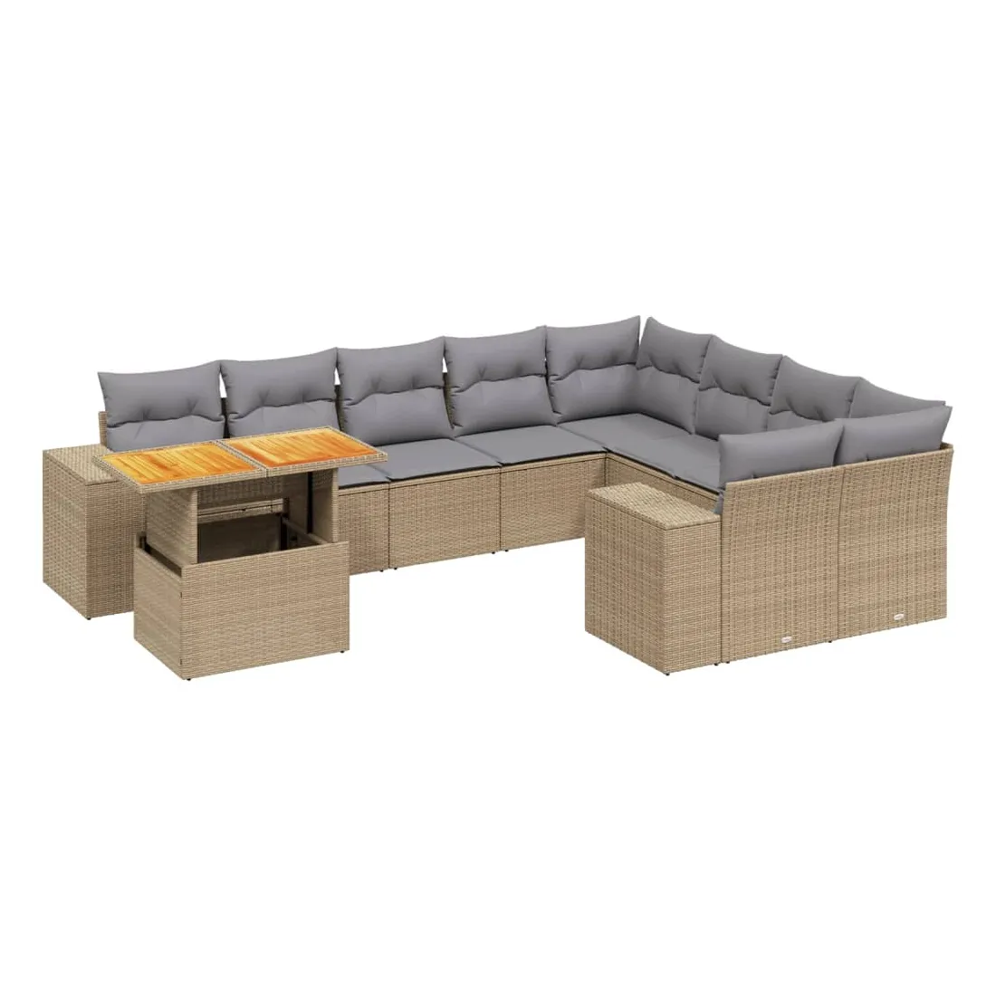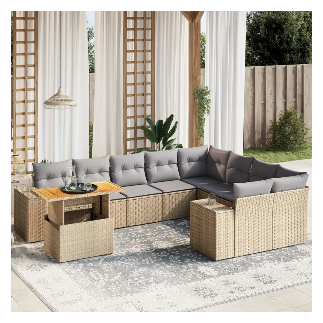 Cet ensemble de canapés de jardin est le complément parfait de votre arrière-cour, terrasse ou patio, offrant un espace confortable et accueillant pour discuter avec la famille et les amis ou simplement se détendre et profiter de l'extérieur. Matériau durable : la résine tressée, également connue sous le nom de poly rotin, est un matériau synthétique solide et nécessitant peu d'entretien qui ressemble au rotin naturel. Il est léger, facile à nettoyer et couramment utilisé pour les meubles d'extérieur en raison de sa durabilité et de ses propriétés de résistance aux intempéries.Dessus de table réglable : le dessus de table peut être soulevé pour rendre la table plus haute, ce qui transforme la table d'extérieur d'une table basse à une table de salle à manger. Elle est parfaite pour recevoir des invités ou prendre des repas à l'extérieur.Expérience d'assise confortable : ce mobilier d'extérieur, doté de coussins épais, offre une expérience d'assise confortable.Housse amovible et lavable : ces coussins de siège sont dotés de housses amovibles pour un lavage et un entretien faciles.Conception modulaire : cet ensemble de meubles d'extérieur a une conception modulaire, ce qui le rend complètement flexible et facile à déplacer, afin que vous puissiez créer un agencement de meubles d'extérieur personnalisé. Bon à savoir :Pour que vos meubles d'extérieur restent beaux, nous vous recommandons de les protéger avec une housse imperméable.