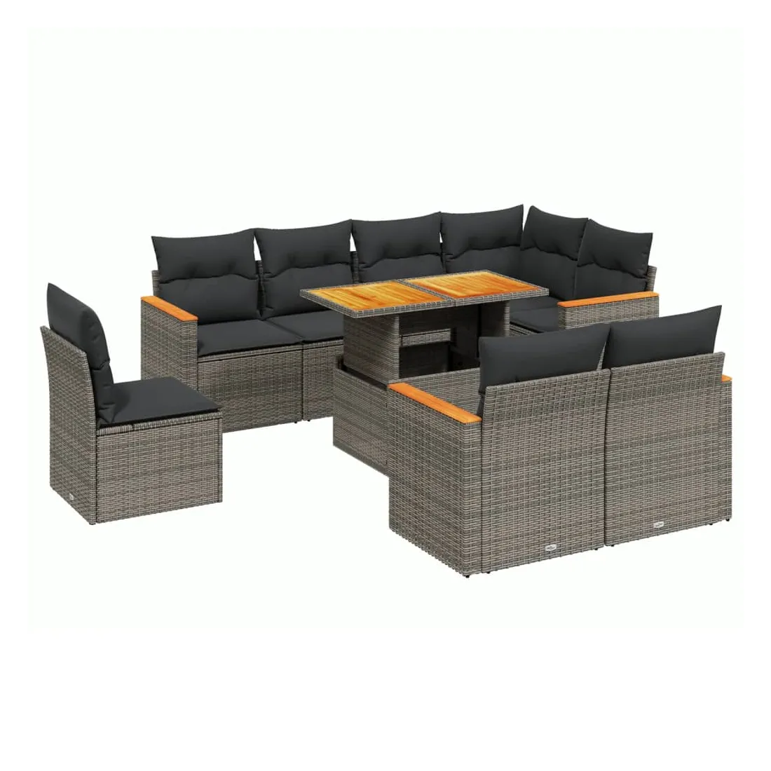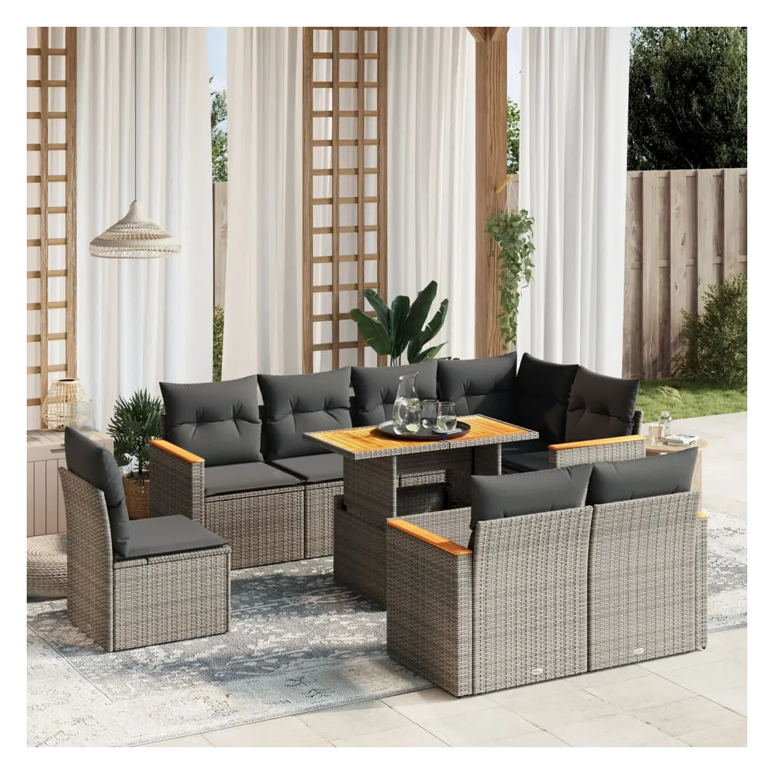 Cet ensemble de canapés de jardin est le complément parfait de votre arrière-cour, terrasse ou patio, offrant un espace confortable et accueillant pour discuter avec la famille et les amis ou simplement se détendre et profiter de l'extérieur. Matériau durable : la résine tressée, également connue sous le nom de poly rotin, est un matériau synthétique solide et nécessitant peu d'entretien qui ressemble au rotin naturel. Il est léger, facile à nettoyer et couramment utilisé pour les meubles d'extérieur en raison de sa durabilité et de ses propriétés de résistance aux intempéries.Dessus de table réglable : le dessus de table peut être soulevé pour rendre la table plus haute, ce qui transforme la table d'extérieur d'une table basse à une table de salle à manger. Elle est parfaite pour recevoir des invités ou prendre des repas à l'extérieur.Expérience d'assise confortable : ce mobilier d'extérieur, doté de coussins épais, offre une expérience d'assise confortable.Housse amovible et lavable : ces coussins de siège sont dotés de housses amovibles pour un lavage et un entretien faciles.Conception modulaire : cet ensemble de meubles d'extérieur a une conception modulaire, ce qui le rend complètement flexible et facile à déplacer, afin que vous puissiez créer un agencement de meubles d'extérieur personnalisé. Bon à savoir :Pour que vos meubles d'extérieur restent beaux, nous vous recommandons de les protéger avec une housse imperméable.