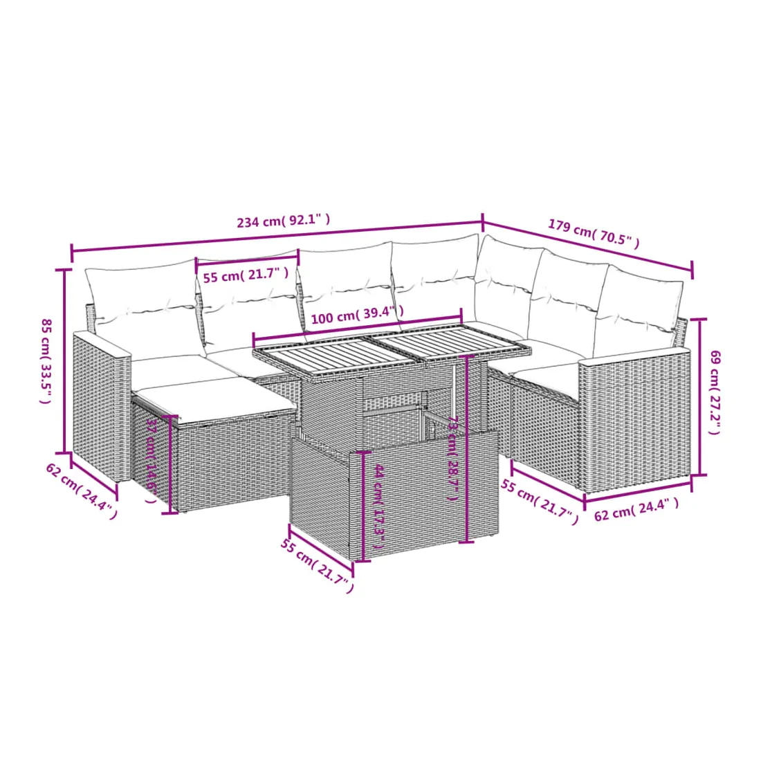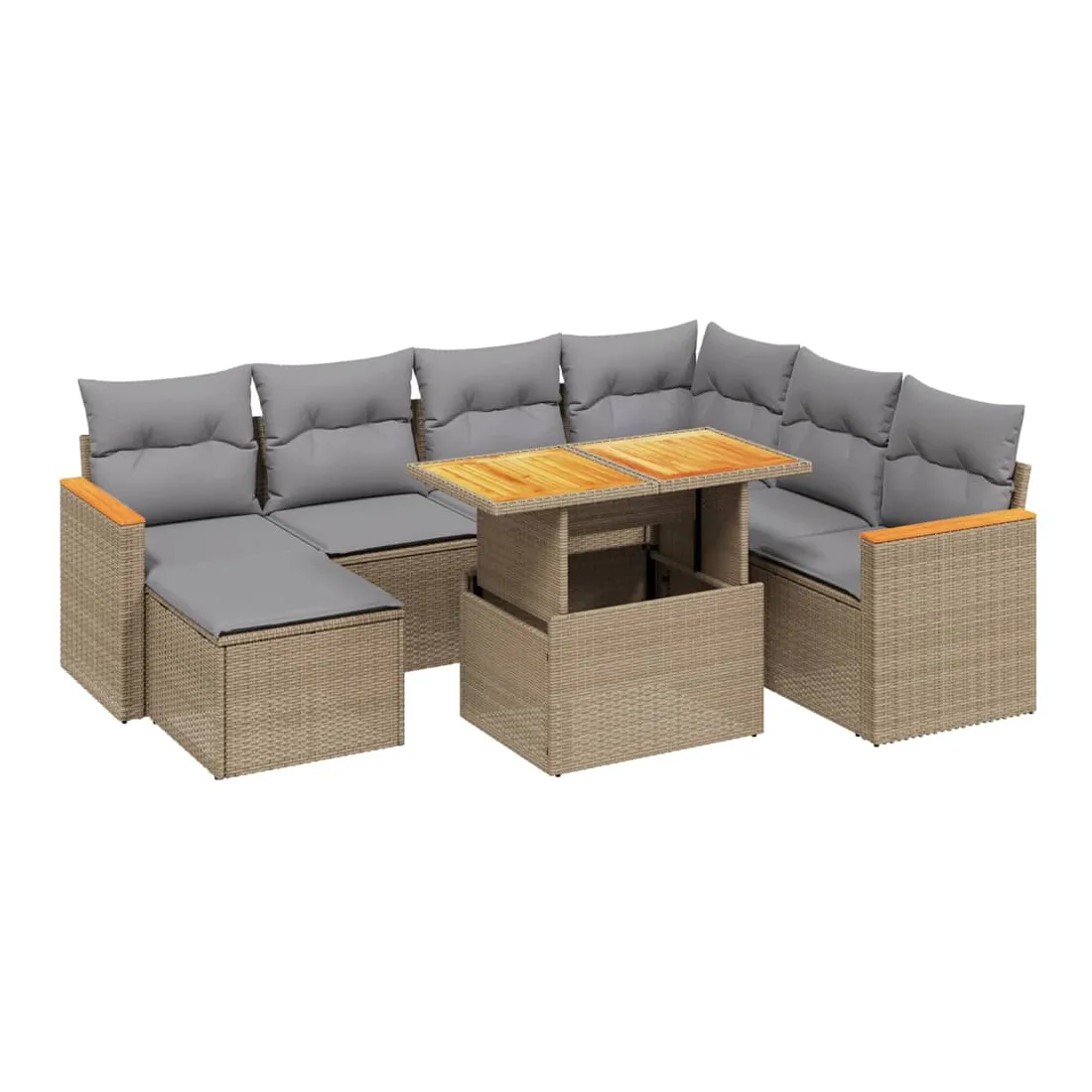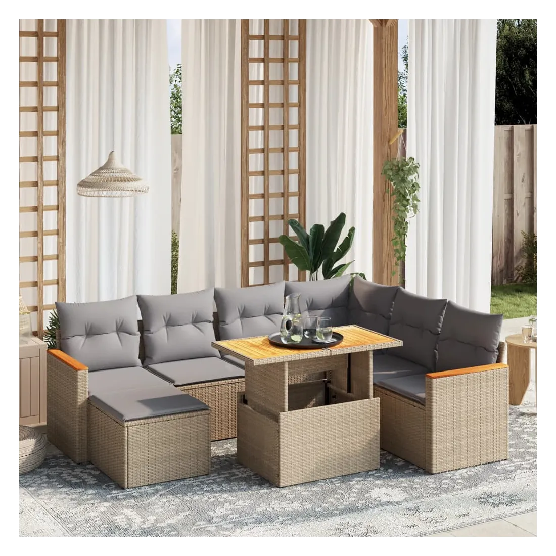 Cet ensemble de canapés de jardin est le complément parfait de votre arrière-cour, terrasse ou patio, offrant un espace confortable et accueillant pour discuter avec la famille et les amis ou simplement se détendre et profiter de l'extérieur. Matériau durable : la résine tressée, également connue sous le nom de poly rotin, est un matériau synthétique solide et nécessitant peu d'entretien qui ressemble au rotin naturel. Il est léger, facile à nettoyer et couramment utilisé pour les meubles d'extérieur en raison de sa durabilité et de ses propriétés de résistance aux intempéries.Dessus de table réglable : le dessus de table peut être soulevé pour rendre la table plus haute, ce qui transforme la table d'extérieur d'une table basse à une table de salle à manger. Elle est parfaite pour recevoir des invités ou prendre des repas à l'extérieur.Expérience d'assise confortable : ce mobilier d'extérieur, doté de coussins épais, offre une expérience d'assise confortable.Housse amovible et lavable : ces coussins de siège sont dotés de housses amovibles pour un lavage et un entretien faciles.Conception modulaire : cet ensemble de meubles d'extérieur a une conception modulaire, ce qui le rend complètement flexible et facile à déplacer, afin que vous puissiez créer un agencement de meubles d'extérieur personnalisé. Bon à savoir :Pour que vos meubles d'extérieur restent beaux, nous vous recommandons de les protéger avec une housse imperméable.