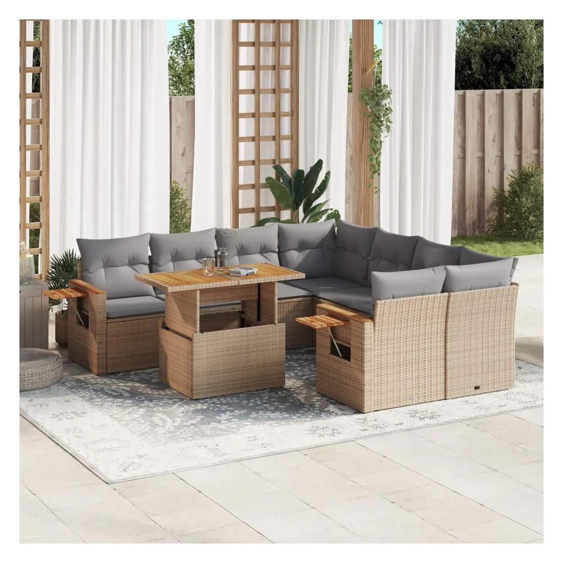 Cet ensemble de canapés de jardin est le complément parfait de votre arrière-cour, terrasse ou patio, offrant un espace confortable et accueillant pour discuter avec la famille et les amis ou simplement se détendre et profiter de l'extérieur. Matériau durable : la résine tressée, également connue sous le nom de poly rotin, est un matériau synthétique solide et nécessitant peu d'entretien qui ressemble au rotin naturel. Il est léger, facile à nettoyer et couramment utilisé pour les meubles d'extérieur en raison de sa durabilité et de ses propriétés de résistance aux intempéries.Dessus de table réglable : le dessus de table peut être soulevé pour rendre la table plus haute, ce qui transforme la table d'extérieur d'une table basse à une table de salle à manger. Elle est parfaite pour recevoir des invités ou prendre des repas à l'extérieur.Table d'appoint pratique : ce mobilier d'extérieur comprend une table d'appoint pliable avec un ressort à gaz sur les accoudoirs, offrant un endroit pratique pour garder vos essentiels à portée de main.Housse amovible et lavable : ces coussins de siège sont dotés de housses amovibles pour un lavage et un entretien faciles.Conception modulaire : cet ensemble de meubles d'extérieur a une conception modulaire, ce qui le rend complètement flexible et facile à déplacer, afin que vous puissiez créer un agencement de meubles d'extérieur personnalisé. Bon à savoir :Pour que vos meubles d'extérieur restent beaux, nous vous recommandons de les protéger avec une housse imperméable.