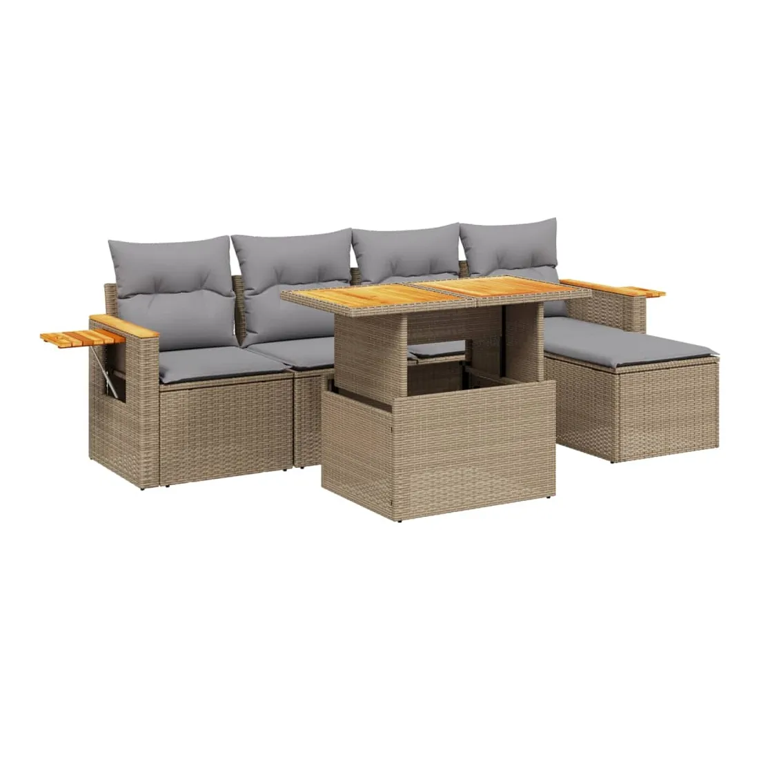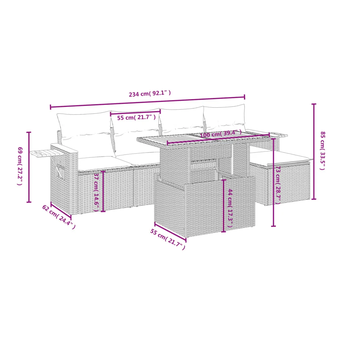 Cet ensemble de canapés de jardin est le complément parfait de votre arrière-cour, terrasse ou patio, offrant un espace confortable et accueillant pour discuter avec la famille et les amis ou simplement se détendre et profiter de l'extérieur. Matériau durable : la résine tressée, également connue sous le nom de poly rotin, est un matériau synthétique solide et nécessitant peu d'entretien qui ressemble au rotin naturel. Il est léger, facile à nettoyer et couramment utilisé pour les meubles d'extérieur en raison de sa durabilité et de ses propriétés de résistance aux intempéries.Dessus de table réglable : le dessus de table peut être soulevé pour rendre la table plus haute, ce qui transforme la table d'extérieur d'une table basse à une table de salle à manger. Elle est parfaite pour recevoir des invités ou prendre des repas à l'extérieur.Table d'appoint pratique : ce mobilier d'extérieur comprend une table d'appoint pliable avec un ressort à gaz sur les accoudoirs, offrant un endroit pratique pour garder vos essentiels à portée de main.Housse amovible et lavable : ces coussins de siège sont dotés de housses amovibles pour un lavage et un entretien faciles.Conception modulaire : cet ensemble de meubles d'extérieur a une conception modulaire, ce qui le rend complètement flexible et facile à déplacer, afin que vous puissiez créer un agencement de meubles d'extérieur personnalisé. Bon à savoir :Pour que vos meubles d'extérieur restent beaux, nous vous recommandons de les protéger avec une housse imperméable.