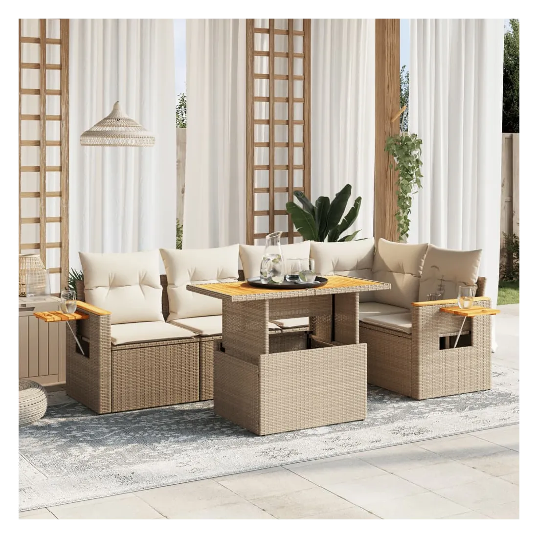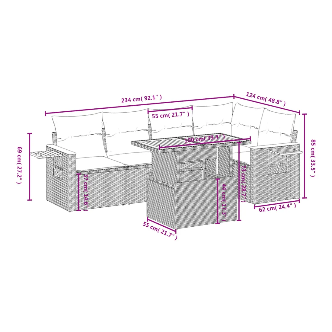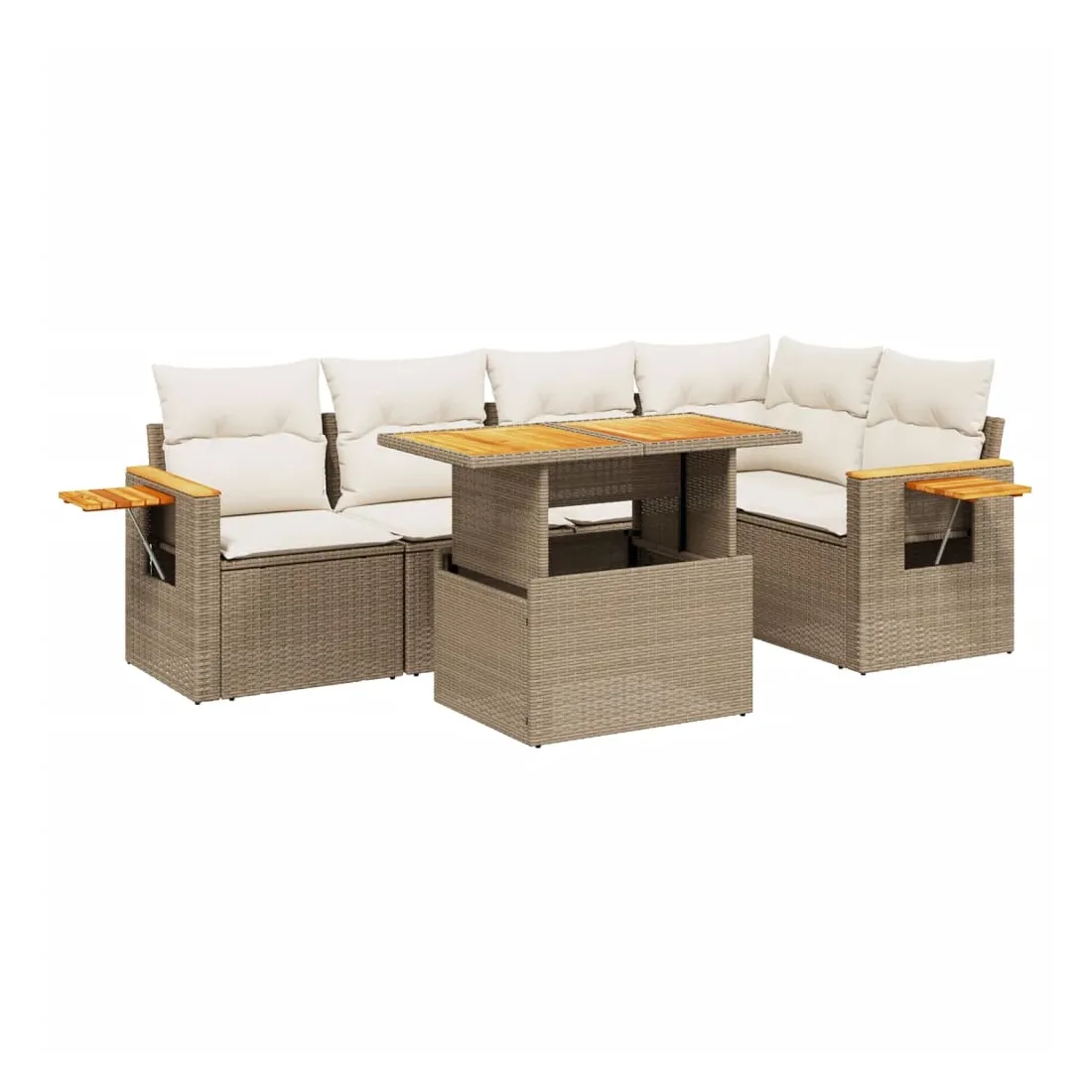 Cet ensemble de canapés de jardin est le complément parfait de votre arrière-cour, terrasse ou patio, offrant un espace confortable et accueillant pour discuter avec la famille et les amis ou simplement se détendre et profiter de l'extérieur. Matériau durable : la résine tressée, également connue sous le nom de poly rotin, est un matériau synthétique solide et nécessitant peu d'entretien qui ressemble au rotin naturel. Il est léger, facile à nettoyer et couramment utilisé pour les meubles d'extérieur en raison de sa durabilité et de ses propriétés de résistance aux intempéries.Dessus de table réglable : le dessus de table peut être soulevé pour rendre la table plus haute, ce qui transforme la table d'extérieur d'une table basse à une table de salle à manger. Elle est parfaite pour recevoir des invités ou prendre des repas à l'extérieur.Table d'appoint pratique : ce mobilier d'extérieur comprend une table d'appoint pliable avec un ressort à gaz sur les accoudoirs, offrant un endroit pratique pour garder vos essentiels à portée de main.Housse amovible et lavable : ces coussins de siège sont dotés de housses amovibles pour un lavage et un entretien faciles.Conception modulaire : cet ensemble de meubles d'extérieur a une conception modulaire, ce qui le rend complètement flexible et facile à déplacer, afin que vous puissiez créer un agencement de meubles d'extérieur personnalisé. Bon à savoir :Pour que vos meubles d'extérieur restent beaux, nous vous recommandons de les protéger avec une housse imperméable.