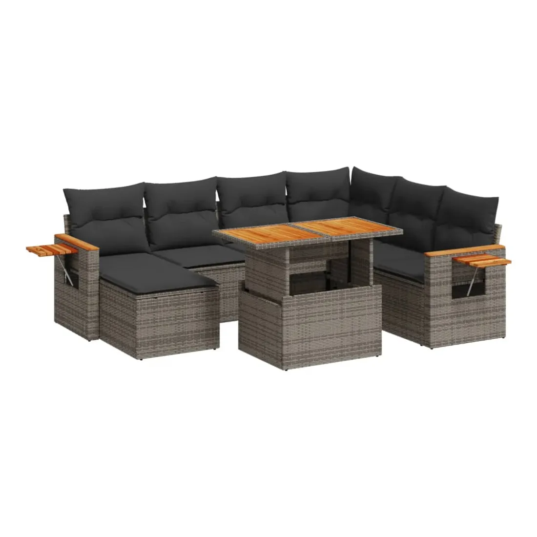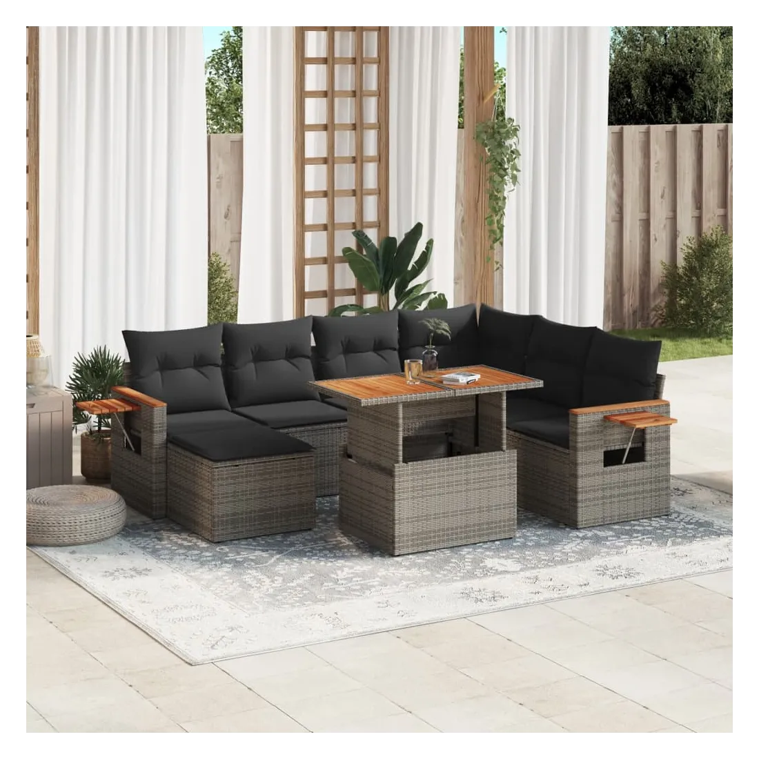 Cet ensemble de canapés de jardin est le complément parfait de votre arrière-cour, terrasse ou patio, offrant un espace confortable et accueillant pour discuter avec la famille et les amis ou simplement se détendre et profiter de l'extérieur. Matériau durable : la résine tressée, également connue sous le nom de poly rotin, est un matériau synthétique solide et nécessitant peu d'entretien qui ressemble au rotin naturel. Il est léger, facile à nettoyer et couramment utilisé pour les meubles d'extérieur en raison de sa durabilité et de ses propriétés de résistance aux intempéries.Dessus de table réglable : le dessus de table peut être soulevé pour rendre la table plus haute, ce qui transforme la table d'extérieur d'une table basse à une table de salle à manger. Elle est parfaite pour recevoir des invités ou prendre des repas à l'extérieur.Table d'appoint pratique : ce mobilier d'extérieur comprend une table d'appoint pliable avec un ressort à gaz sur les accoudoirs, offrant un endroit pratique pour garder vos essentiels à portée de main.Housse amovible et lavable : ces coussins de siège sont dotés de housses amovibles pour un lavage et un entretien faciles.Conception modulaire : cet ensemble de meubles d'extérieur a une conception modulaire, ce qui le rend complètement flexible et facile à déplacer, afin que vous puissiez créer un agencement de meubles d'extérieur personnalisé. Bon à savoir :Pour que vos meubles d'extérieur restent beaux, nous vous recommandons de les protéger avec une housse imperméable.