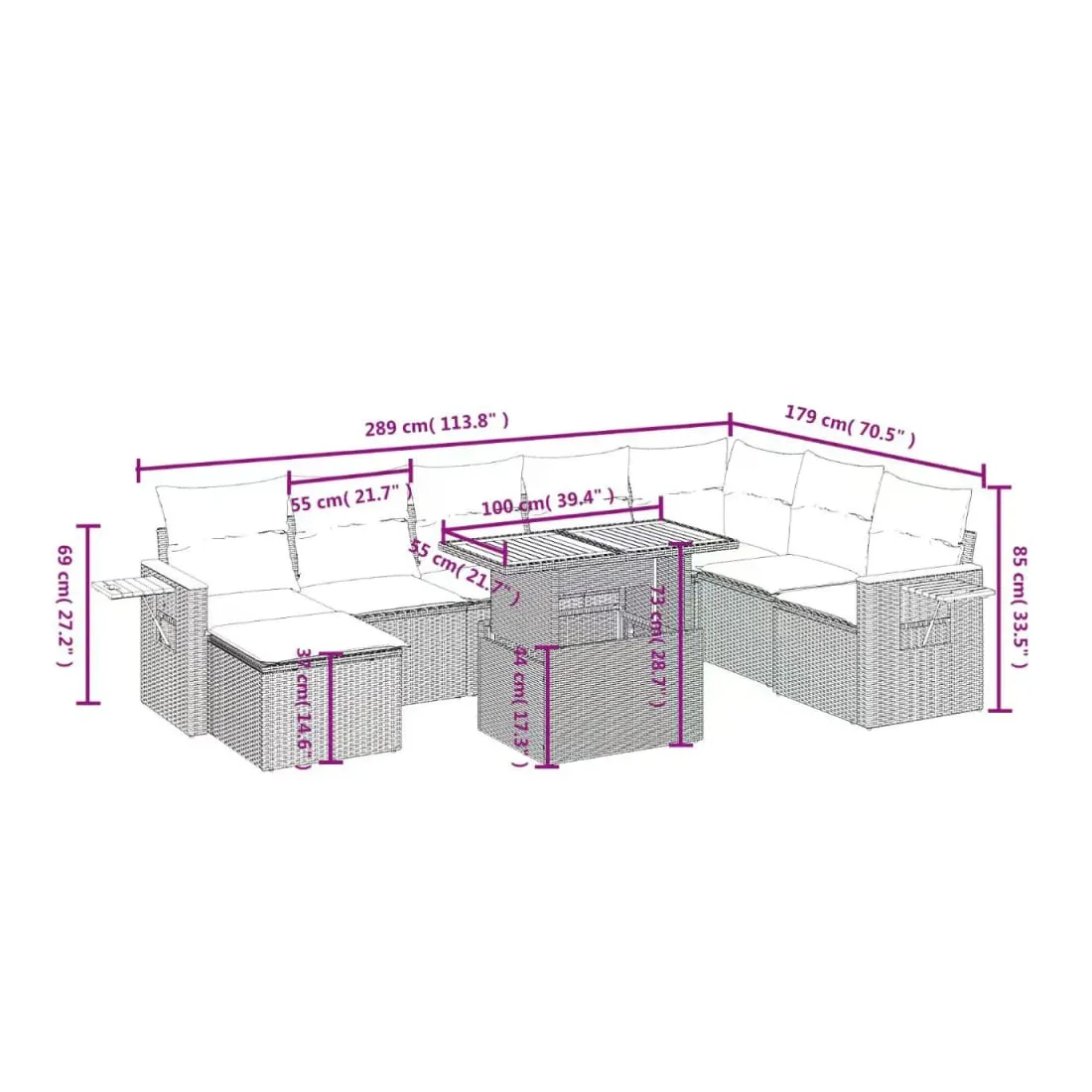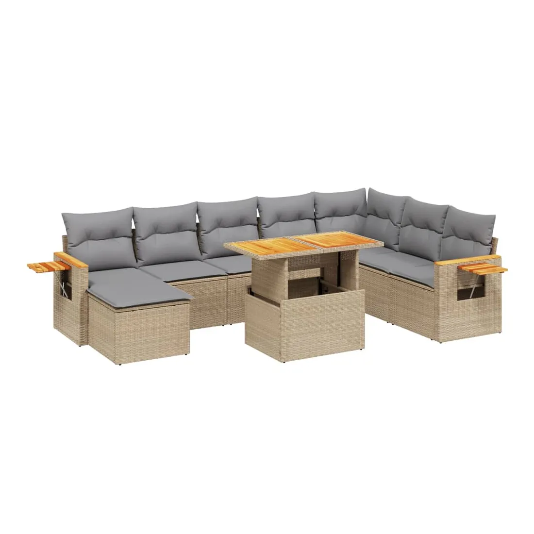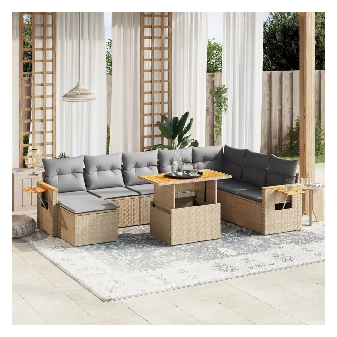 Cet ensemble de canapés de jardin est le complément parfait de votre arrière-cour, terrasse ou patio, offrant un espace confortable et accueillant pour discuter avec la famille et les amis ou simplement se détendre et profiter de l'extérieur. Matériau durable : la résine tressée, également connue sous le nom de poly rotin, est un matériau synthétique solide et nécessitant peu d'entretien qui ressemble au rotin naturel. Il est léger, facile à nettoyer et couramment utilisé pour les meubles d'extérieur en raison de sa durabilité et de ses propriétés de résistance aux intempéries.Dessus de table réglable : le dessus de table peut être soulevé pour rendre la table plus haute, ce qui transforme la table d'extérieur d'une table basse à une table de salle à manger. Elle est parfaite pour recevoir des invités ou prendre des repas à l'extérieur.Table d'appoint pratique : ce mobilier d'extérieur comprend une table d'appoint pliable avec un ressort à gaz sur les accoudoirs, offrant un endroit pratique pour garder vos essentiels à portée de main.Housse amovible et lavable : ces coussins de siège sont dotés de housses amovibles pour un lavage et un entretien faciles.Conception modulaire : cet ensemble de meubles d'extérieur a une conception modulaire, ce qui le rend complètement flexible et facile à déplacer, afin que vous puissiez créer un agencement de meubles d'extérieur personnalisé. Bon à savoir :Pour que vos meubles d'extérieur restent beaux, nous vous recommandons de les protéger avec une housse imperméable.