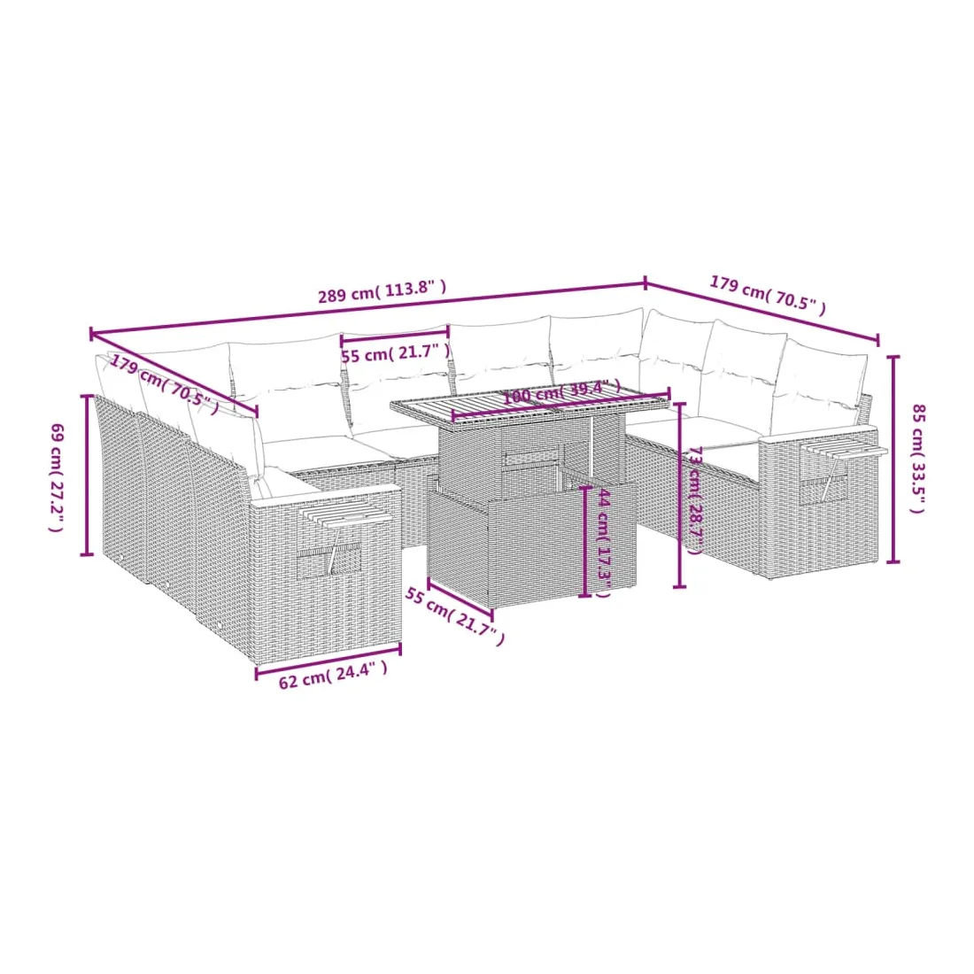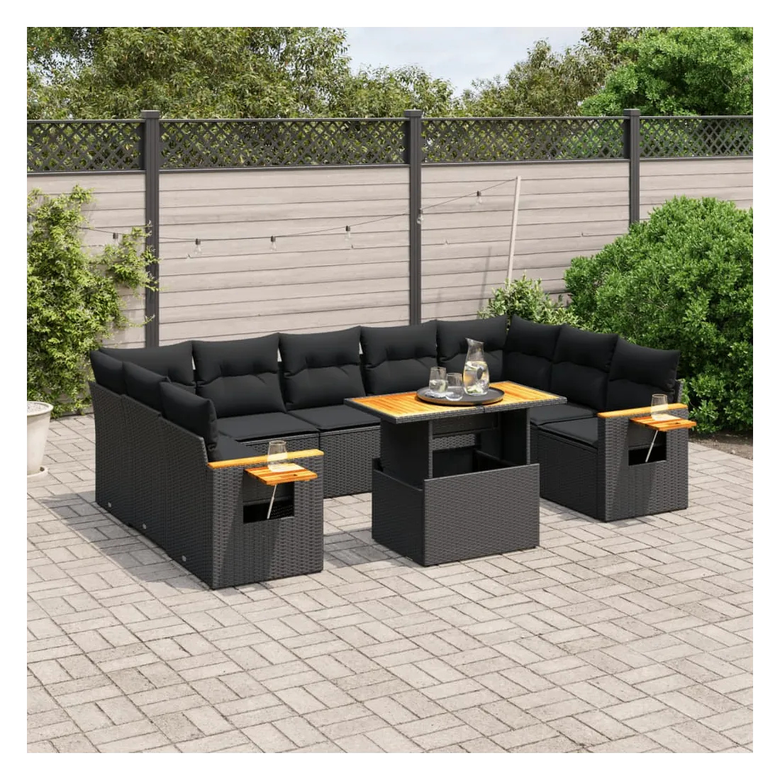 Cet ensemble de canapés de jardin est le complément parfait de votre arrière-cour, terrasse ou patio, offrant un espace confortable et accueillant pour discuter avec la famille et les amis ou simplement se détendre et profiter de l'extérieur. Matériau durable : la résine tressée, également connue sous le nom de poly rotin, est un matériau synthétique solide et nécessitant peu d'entretien qui ressemble au rotin naturel. Il est léger, facile à nettoyer et couramment utilisé pour les meubles d'extérieur en raison de sa durabilité et de ses propriétés de résistance aux intempéries.Dessus de table réglable : le dessus de table peut être soulevé pour rendre la table plus haute, ce qui transforme la table d'extérieur d'une table basse à une table de salle à manger. Elle est parfaite pour recevoir des invités ou prendre des repas à l'extérieur.Table d'appoint pratique : ce mobilier d'extérieur comprend une table d'appoint pliable avec un ressort à gaz sur les accoudoirs, offrant un endroit pratique pour garder vos essentiels à portée de main.Housse amovible et lavable : ces coussins de siège sont dotés de housses amovibles pour un lavage et un entretien faciles.Conception modulaire : cet ensemble de meubles d'extérieur a une conception modulaire, ce qui le rend complètement flexible et facile à déplacer, afin que vous puissiez créer un agencement de meubles d'extérieur personnalisé. Bon à savoir :Pour que vos meubles d'extérieur restent beaux, nous vous recommandons de les protéger avec une housse imperméable.